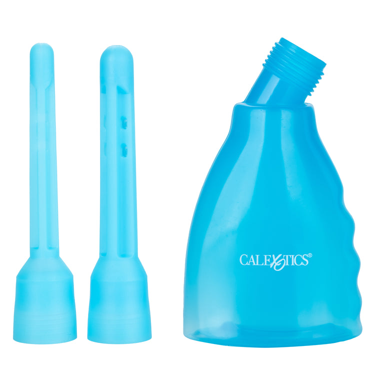 Reusable douche system with transparent bottle and 2 interchangeable nozzles, regular and slim.