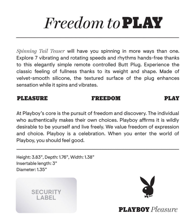 Spinning Tail Teaser will have you spinning in more ways than one. Explore 7 vibrating and rotating speeds and rhythms hands-free thanks to this elegantly simple remote controlled Butt Plug. Experience the classic feeling of fullness thanks to its weight and shape. Made of velvet-smooth silicone, the textured surface of the plug enhances sensation while it spins and vibrates.
