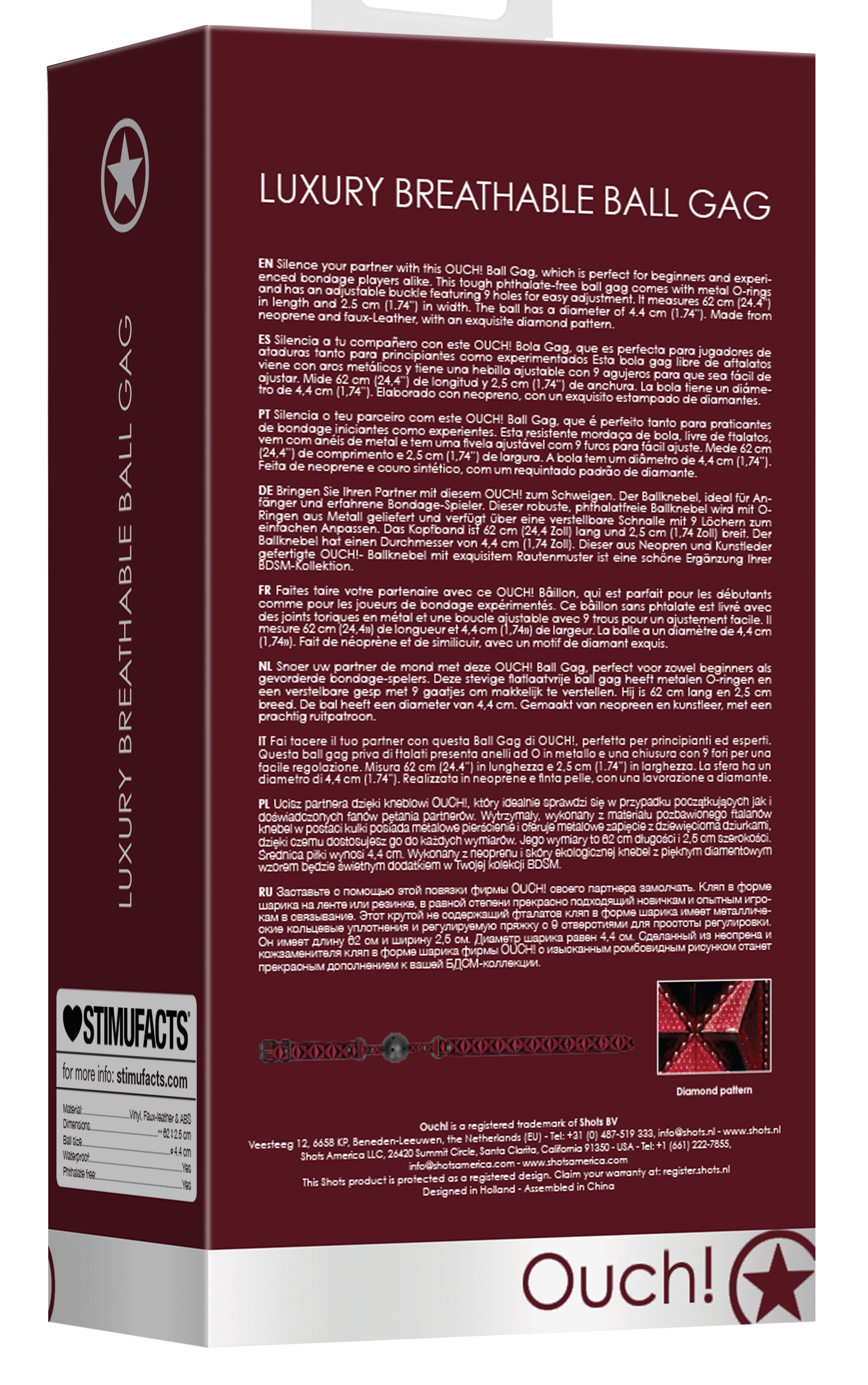 Silence your partner with this OUCH! Ball Gag, which is perfect for beginners and experienced bondage players alike. This tough phthalate-free ball gag comes with metal O-rings and has an adjustable buckle featuring 9 holes for easy adjustment. Made from neoprene and faux-Leather, with an exquisite diamond pattern