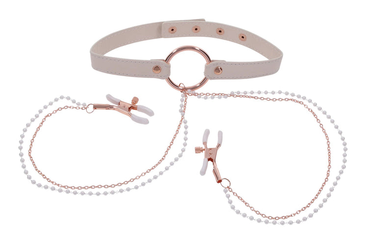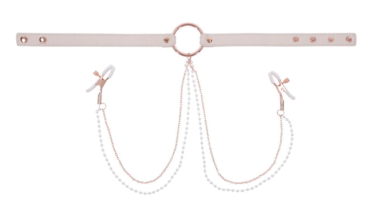 Spice up your playtime with the peaches ‘n creame collar with nipple clamps and experience extraordinary pleasure! This playful accessory blends luxury with a touch of naughtiness, featuring a delightful peach-colored collar adorned with rose gold hardware and tantalizing attached nipple clamps! The soft faux fur lining ensures comfort, while the adjustable collar guarantees a snug fit for all peach enthusiasts. Secure the rose gold clasp, let the nipple clamps do their flirty magic, and get ready to turn up the heat in your intimate moments. Whether you're a curious beginner or a seasoned adventurer, this playful accessory adds a dash of charm and a hint of sweetness to your escapades.