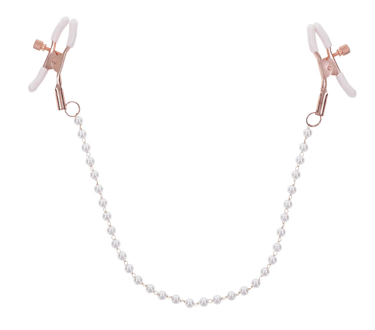 Take a tastefully tantalizing step into deeper sensations with the peaches ‘n creame pearl nipple clamps. Explore delicious sensitivity right where you want it most with dual adjustable clamps in stunning rose gold with pearl accents. White rubberized tips add a playful pop of color to your play and keep the clamps from slipping as you tease and pull your lover's chain, bringing intense feelings to their body.