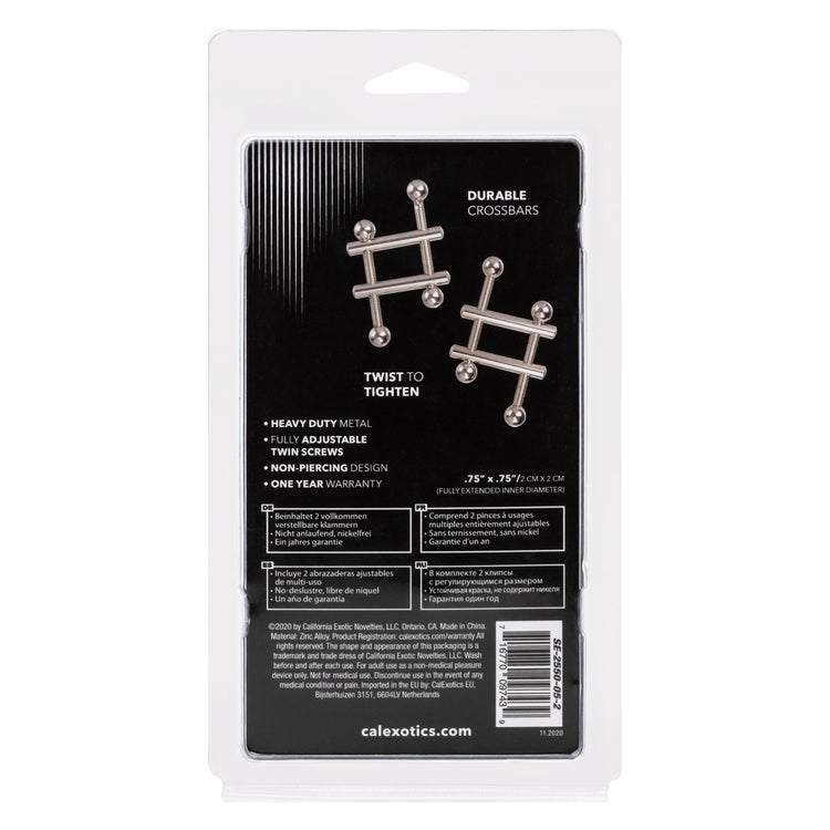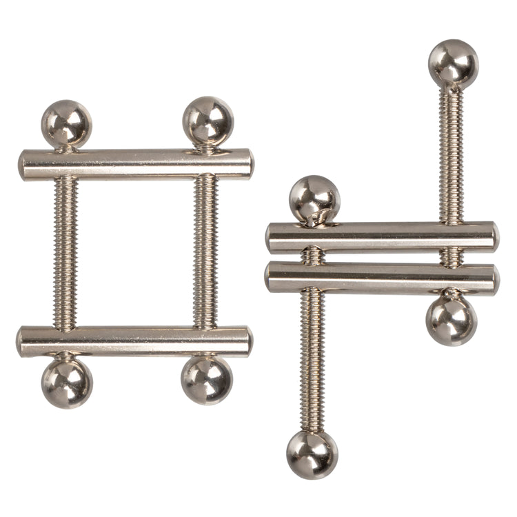 The fully adjustable crossbar design lets you control the pressure. Screw the crossbar closer together for a tight fit, or move thm further apart for a loose fit. These nipple vices offer a totally customizable pleasure experience, and the fully-adjustable design allows for use on all body types.