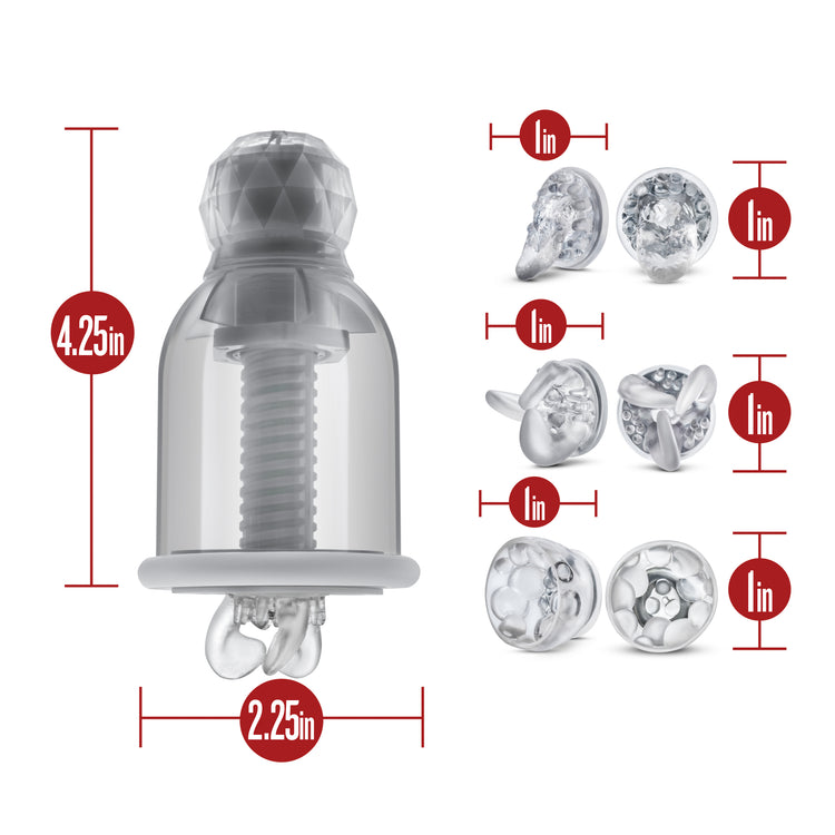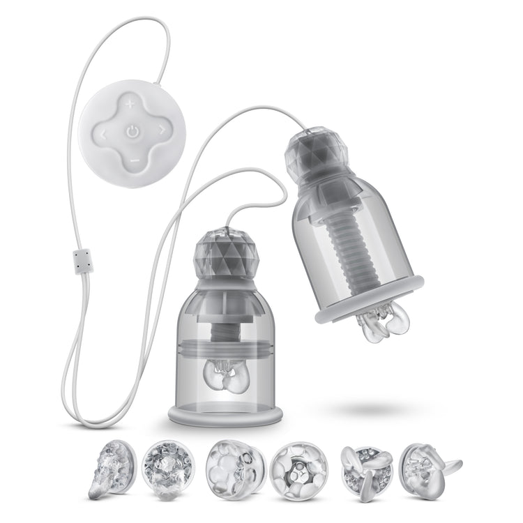 The Titillator is a unique toy designed to deliver both suction and the sensation of movement. It includes two clear cylinders, connected with an easy to navigate, variable speed and sensation controller, and three styles of soft attachments.