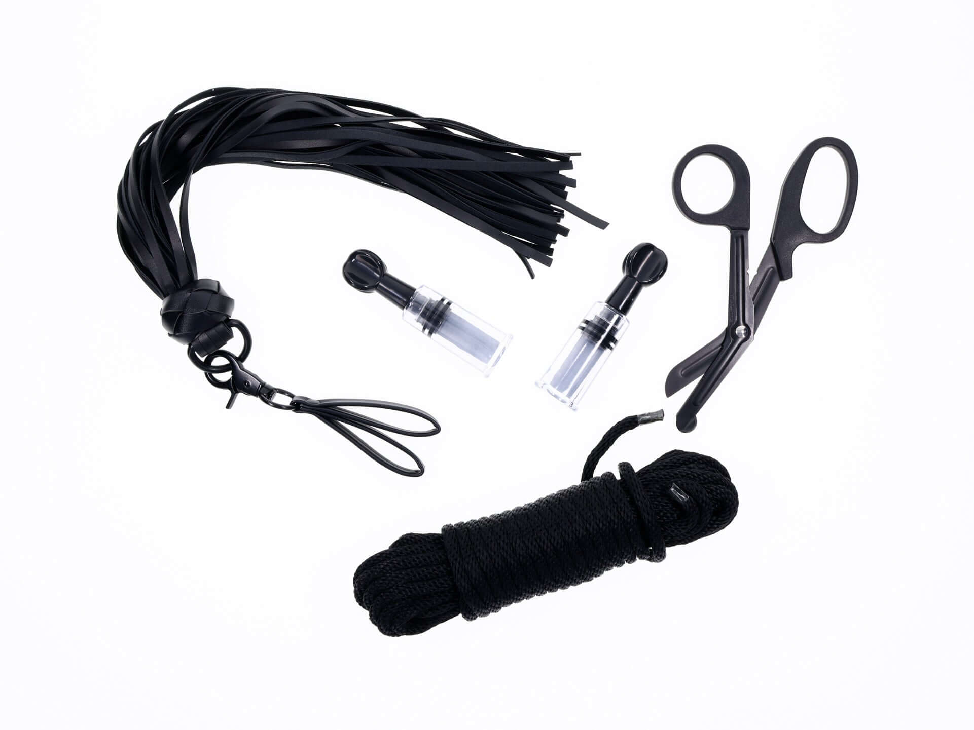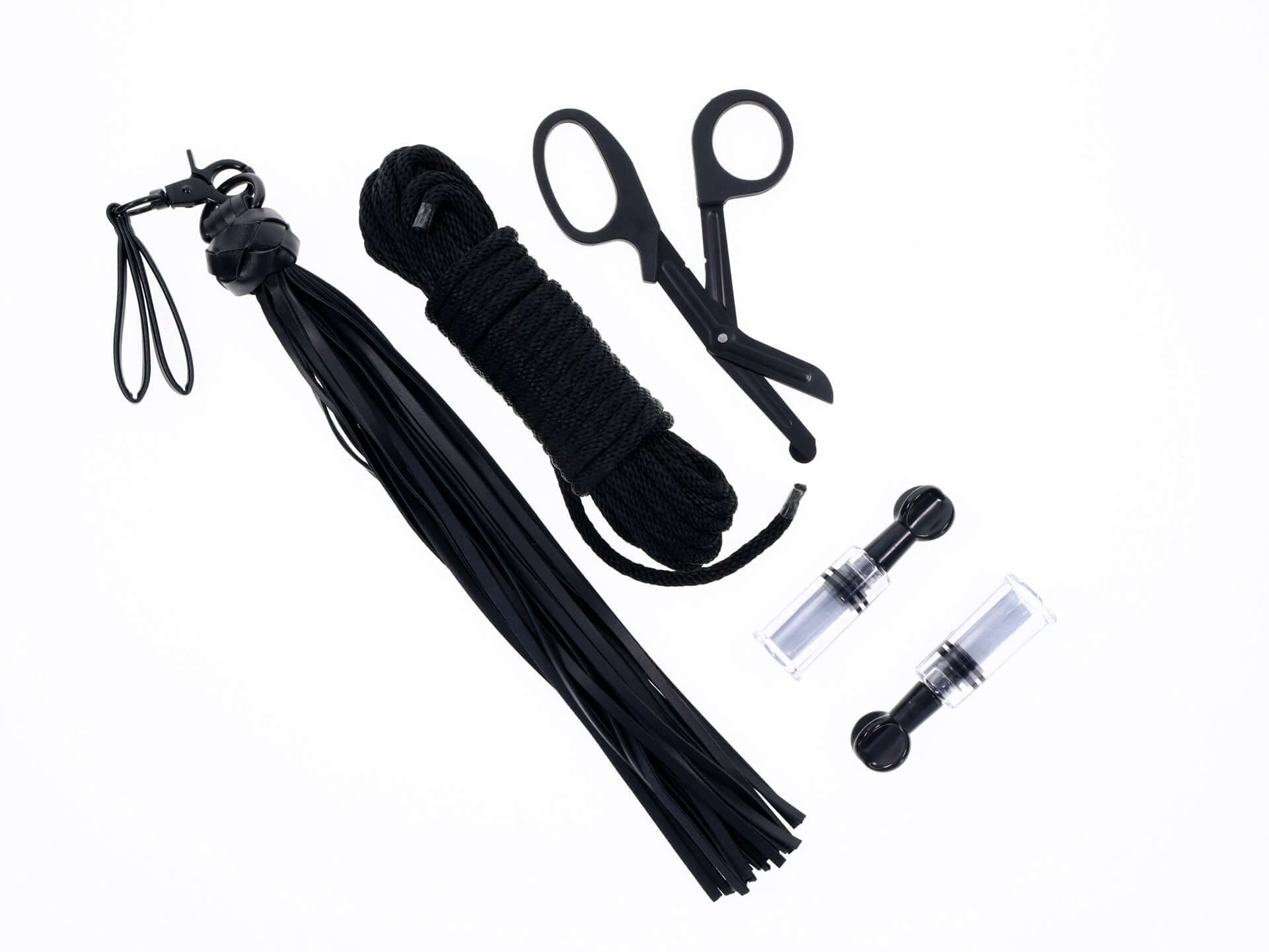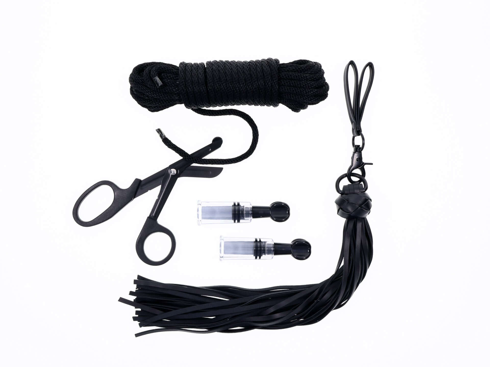 • Included: finger flogger, nipple suckers, safety scissors, and rope