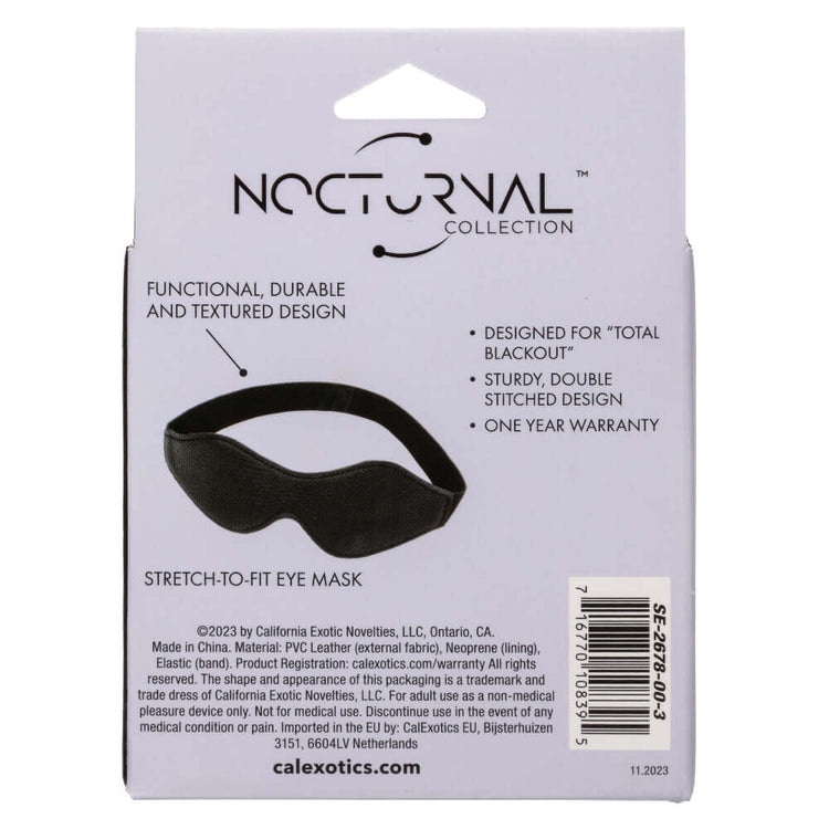 The eye mask's functional, durable, and textured construction makes it a   versatile tool for enhancing your sensory experiences. With its sophisticated   design and exceptional functionality, the Nocturnal Collection Eye Mask is ideal for those eager to fully immerse themselves in their private moment of  total darkness.