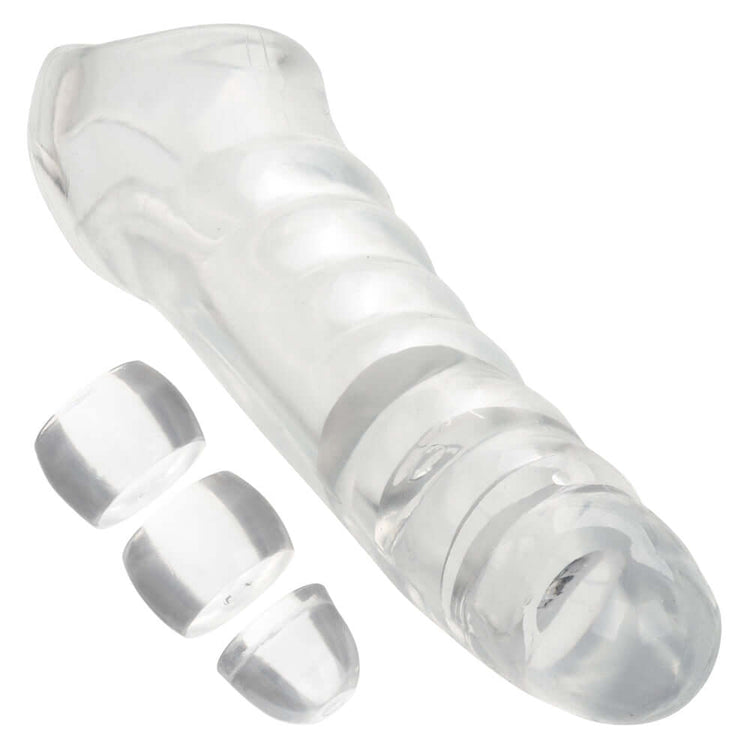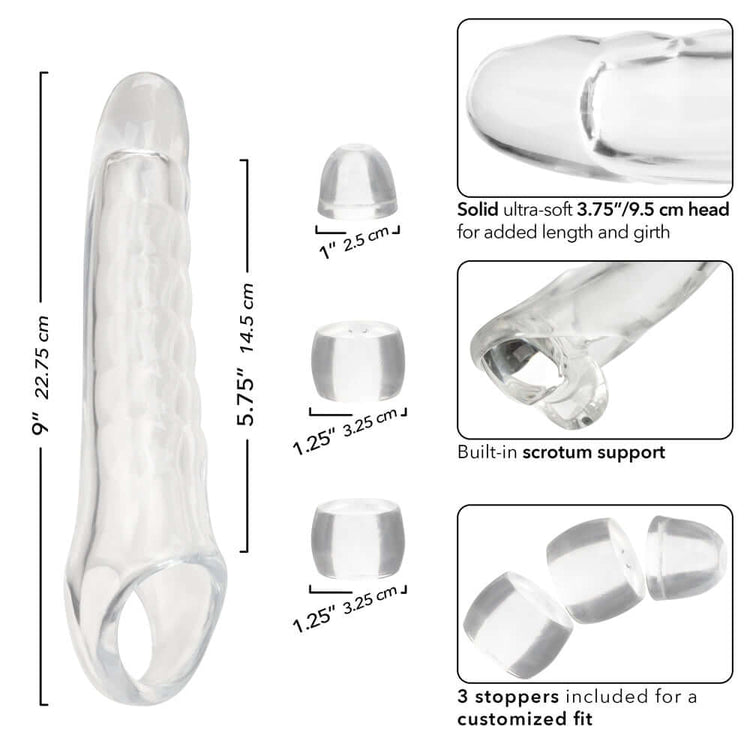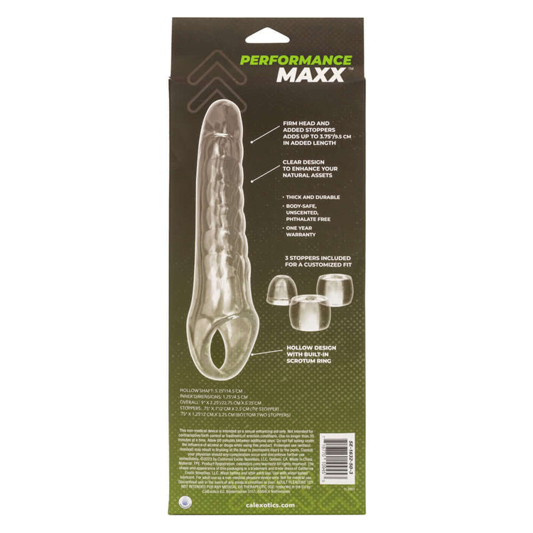 The Performance Maxx Clear Extension Kit is a revolutionary tool designed to  enhance and intensify your intimate encounters. Featuring a solid ultra-soft  head, measuring 3.75" / 9.5 cm, this extension provides both additional length  and girth, ensuring a deeply satisfying experience for you and your partner.
