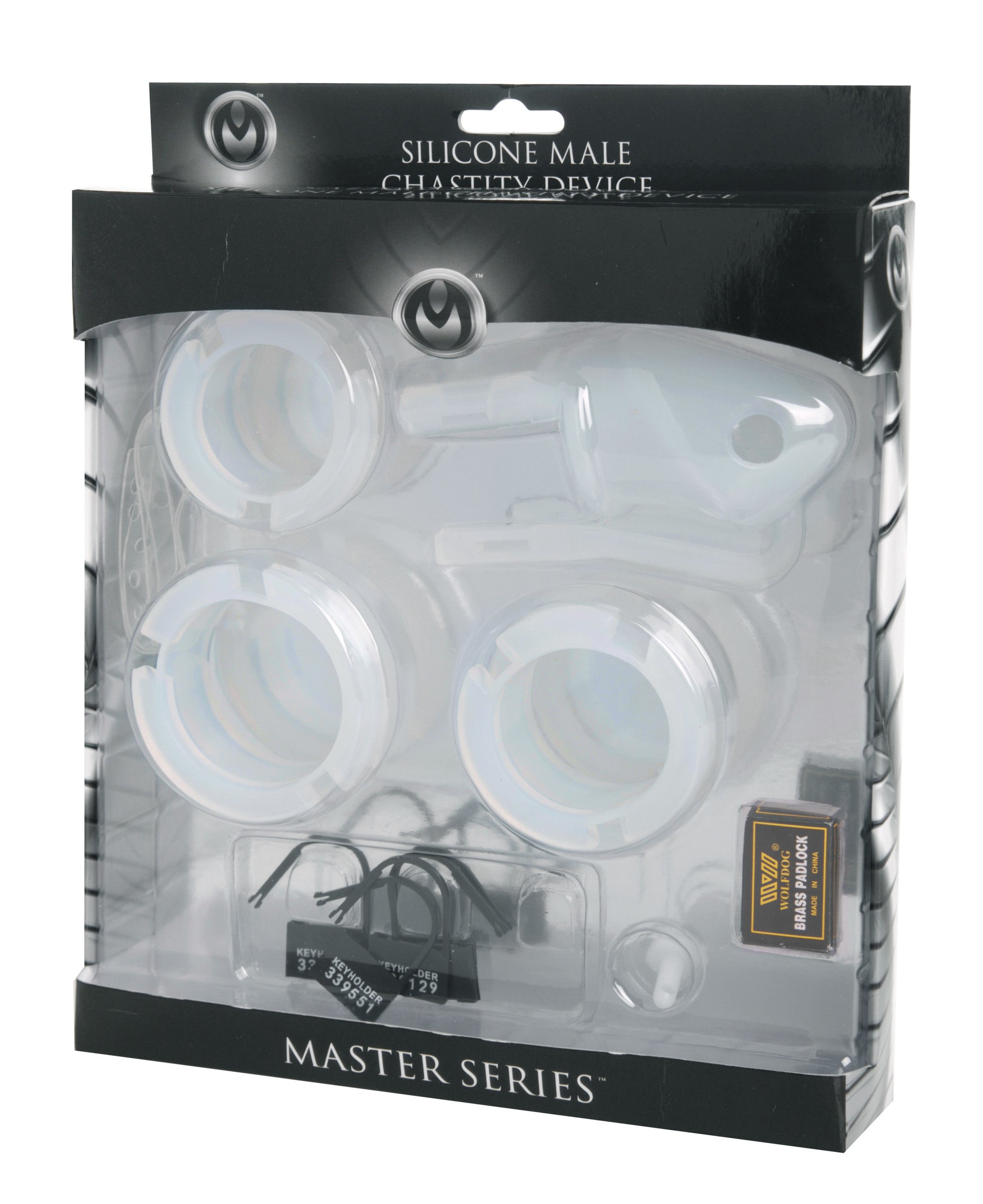 Sexual denial has never been this comfortably restrictive. Flexible and lightweight, the Sado Chamber Chastity Cage is designed for long term wear. This intriguing confinement piece will hold them in submission for extended periods, while remaining undetected under clothing. The cage and rings are made entirely of premium silicone. Choose one of the 3 provided rings, place it behind the cock and balls, then slide the cage over the penis. Slide the straps through the cage. Lock them up using either the included padlock of individually numbered temporary locks. The cage of the piece is outfitted with ventilation holes, allowing the wearer to wash without removal. The Sado Chamber comes complete with a silicone cock cage, three sized rings, two tie down straps, a padlock with two keys, and five individually numbered plastic locks.