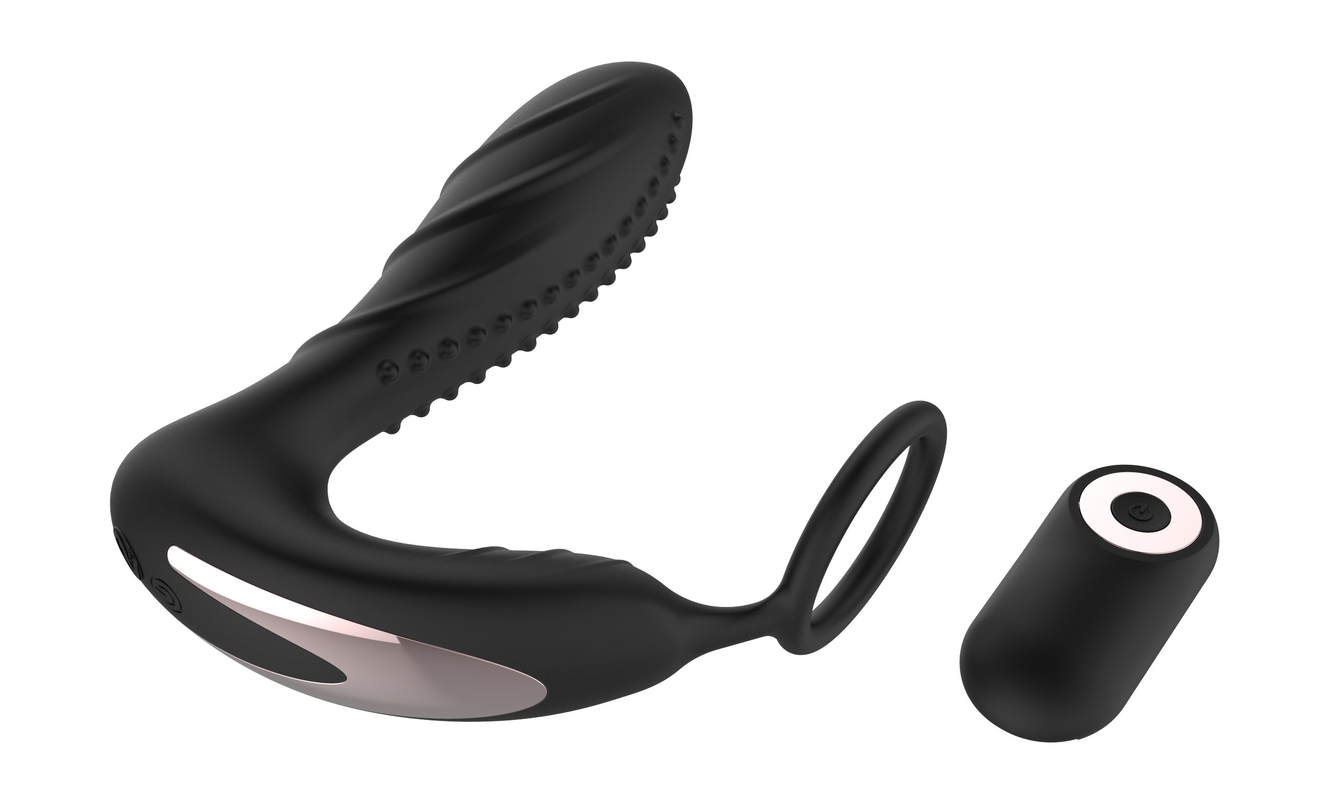 Become encased in pleasurable sensations with the ENRAPT Prostate Vibe with wireless remote and C-ring for internal and external stimulation.