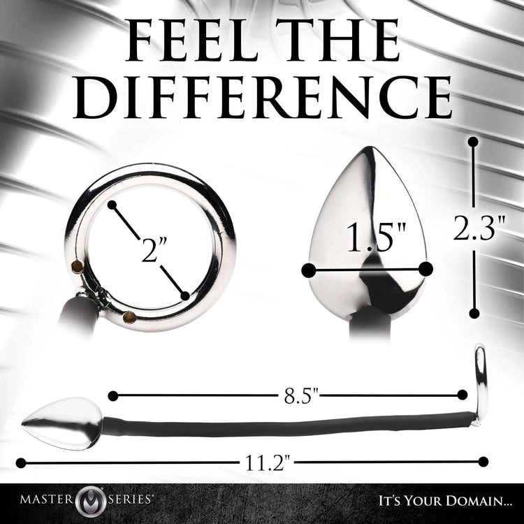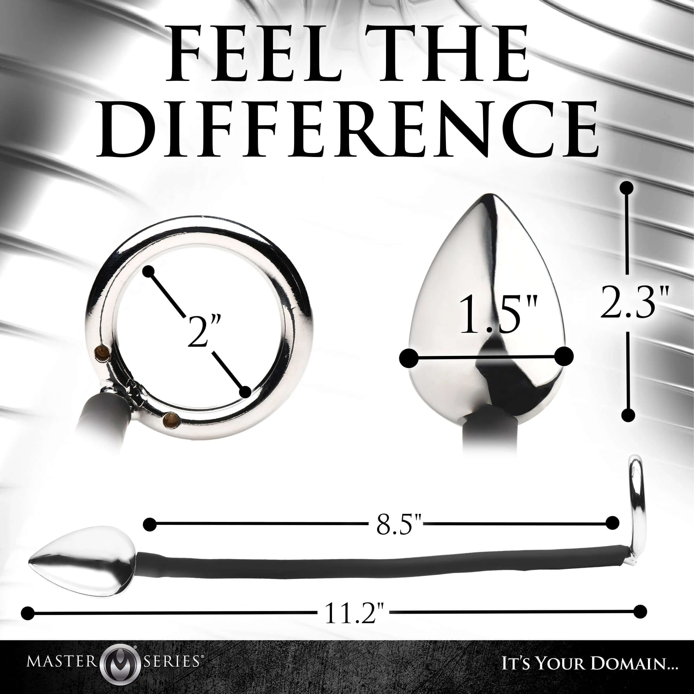 Enjoy a rock hard shaft and prostate stimulation with a single toy! This dual stimulating Tug and Plug Cock and Ball Ring with Anal Plug is sexy, kinky, and perfect for all experience levels. The tapered tip of the plug helps make insertion easy and the smooth, aluminum alloy glides right in with the help of some lube. The plug connects to a silicone cord. At the end of the cord is an iron ring that slips over your shaft and acts as a C-ring so you can last longer, stay harder and enjoy more even as your prostate is getting stimulated by the anal plug. The metal is also temperature sensitive so you can enjoy temperature play by warming or cooling them down using hot or cold water. All metal is nickel-free for sensitive skin. The silicone cord is made from phthalate-free, premium silicone and is body-safe. Use only with water-based or oil-based lubricants for best results.