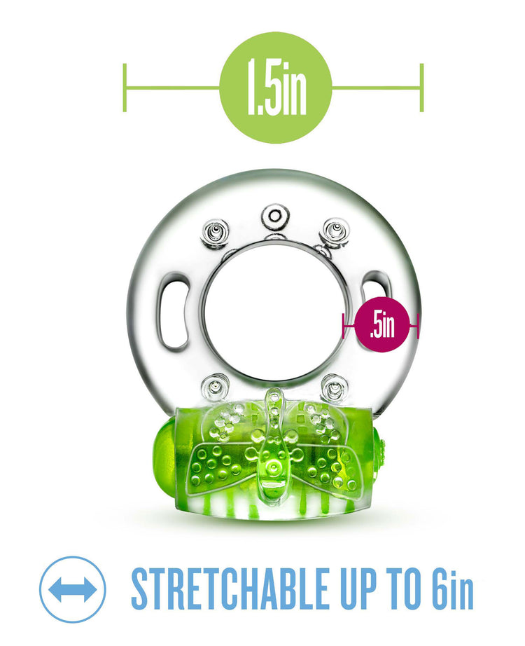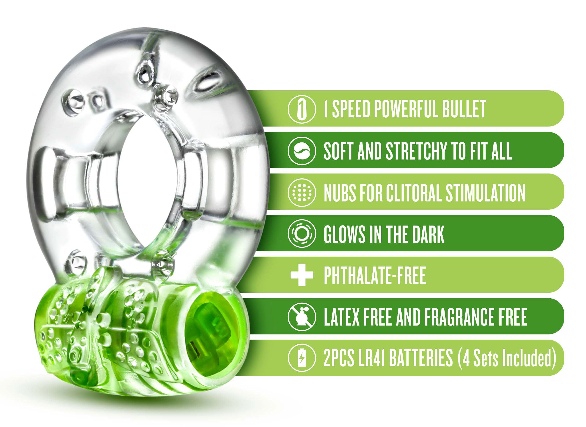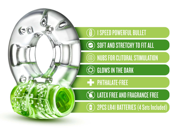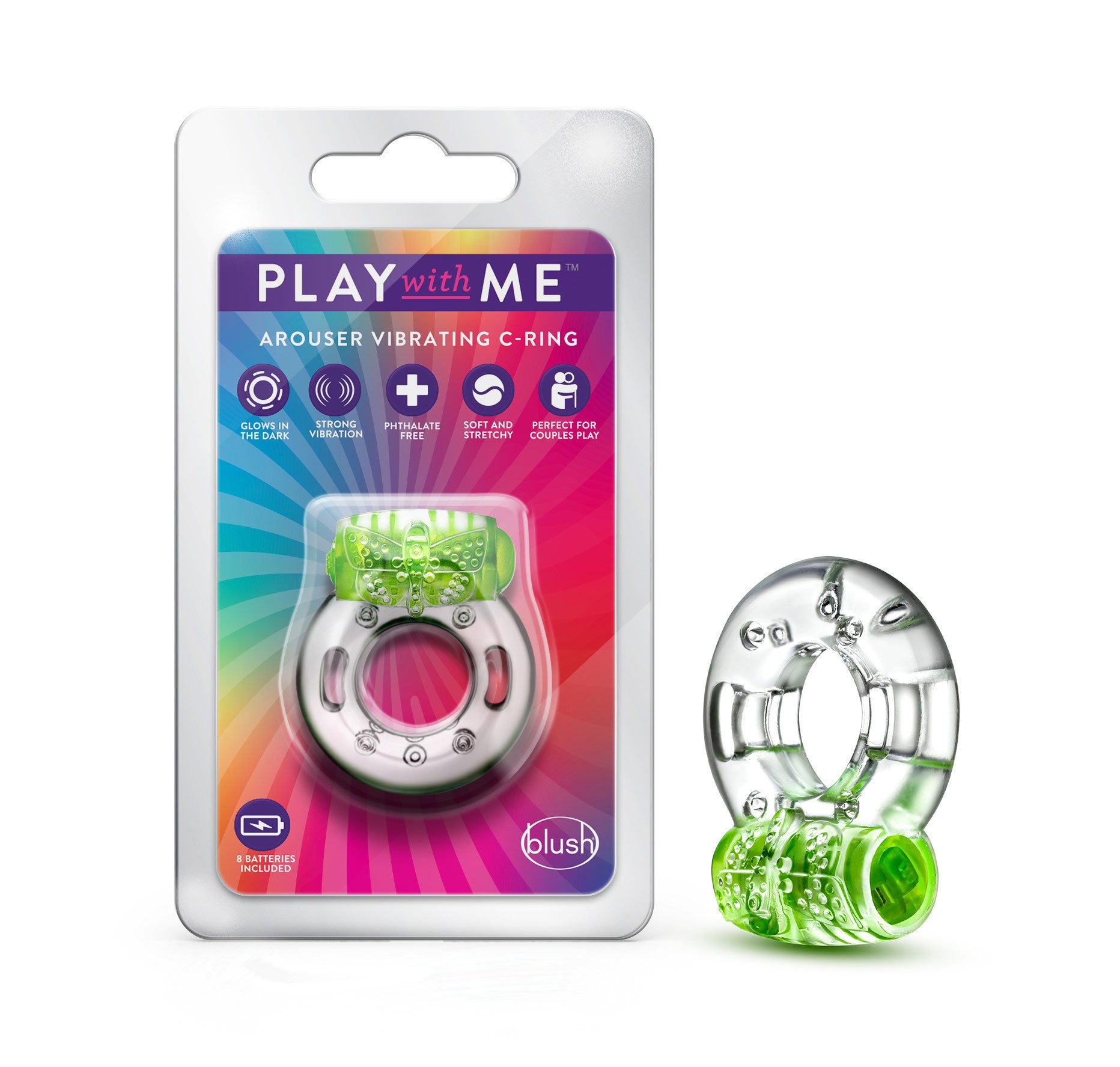 Amplify your pleasure and extend your playtime! Play With Me Vibrating C-Rings can be worn around the base of the shaft or underneath the balls and are soft and stretchy to comfortably fit all. Soft nubs along the vibrating bullet stimulate the clitoris during use. Position the vibrating bullet between you and your partner during partner play or directly on any pleasure point on your own body during solo play and use the vibration for additional stimulation 1 thoughtfully tuned vibration setting optimized for pleasure. Requires 2 LR41 batteries - 4 sets included.
