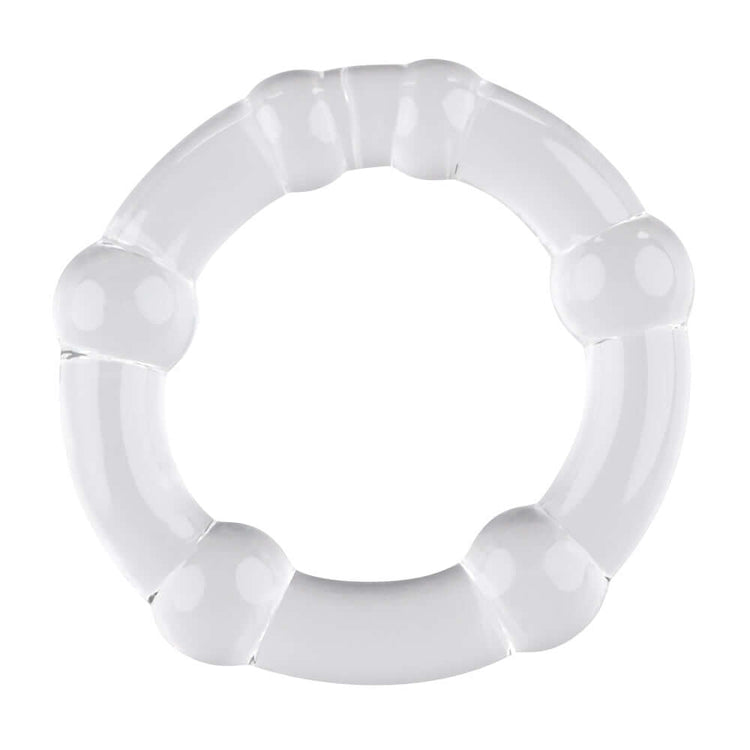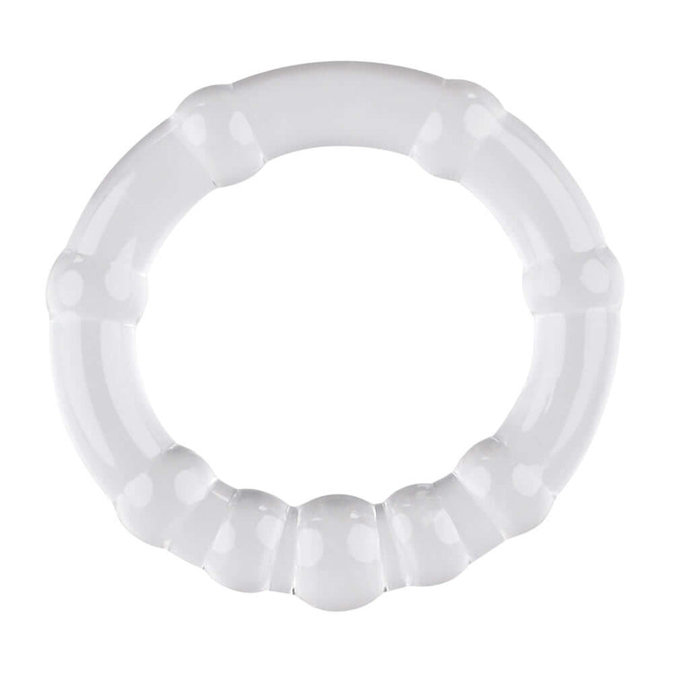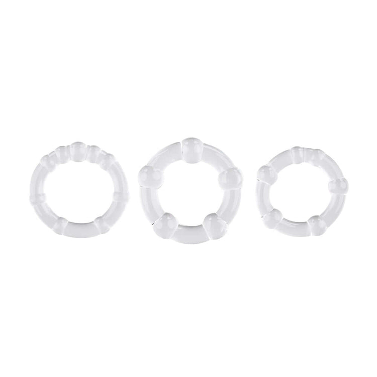 Strengthen your erection with this 3-ring collection that offers 3 leveld of  support - snug, tight and intense. Use one super-stretchy ring at a time or all  3 at once to enjoy a harder, girthier experience.