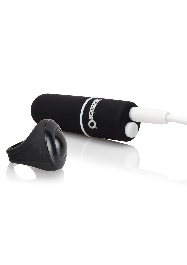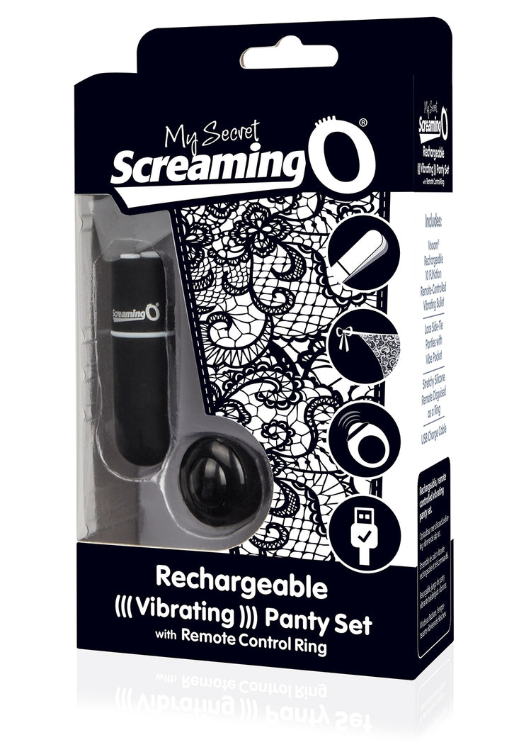 Rechargeable vibrating panty set with remote control ring. Lace side-tie panties in a one size fits most size features a secret pocket to keep your vibe right where you want it! (Fits up to 60" waist). Vooom rechargeable bullet with 10 functions that wirelessly sync with remote-control ring or works on its own. The remote is disguised as a ring! Discreet push-button remote looks like an ordinary finger ring and works up to 50 feet away! Made of stretchy silicone to fit almost any size finger.