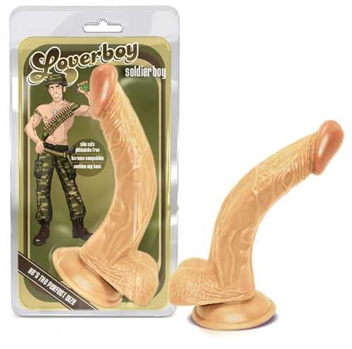 Soldier Boy has a slim 8-inch shaft with unique curve that makes him great for G-spot and p-spot stimulation. Phthalate and latex free he is fun and safe. His suction cup makes him easy to use in any scenario and he is harness compatible.
