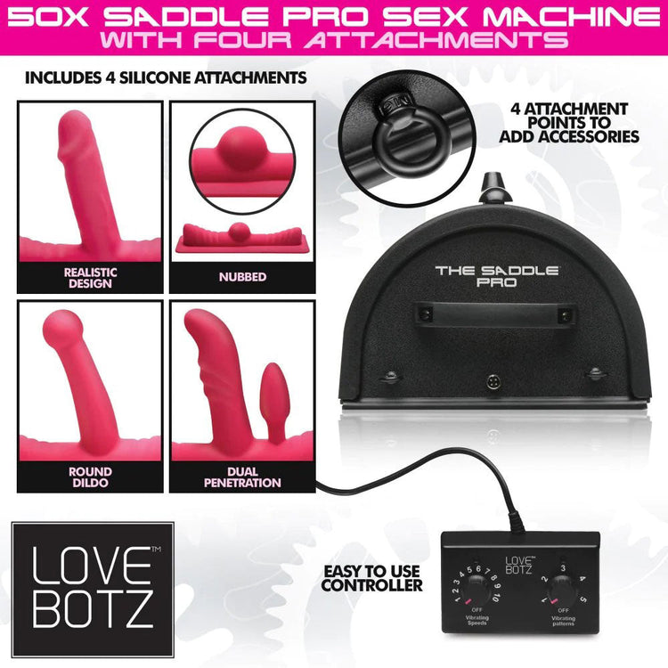 Get back in the saddle and see how long you can ride this Saddle Pro Sex Machine! Built to be durable and handle up to 485 lbs, it's for those of us who want intense, long-lasting pleasure without worrying about getting too wild or rough for the machine to handle! The rideable base begs for your legs to wrap around it and for you to sit on one of the attachments as the intense, rumbling vibrations buzz through the toys inside you! Enjoy the sturdy, solid feeling of metal covered in thick plastic beneath you. Slip in a phthalate-free, premium grade silicone attachment. There are four delicious ones to choose from! Enjoy a large, realistic dildo. Try out a long dildo with a round, ball end to hit your sweet spots such as the A-spot, G-spot or P-spot. Get double penetrated with the dual attachment of a ribbed dildo and a small anal plug! Or enjoy rubbing one out on the delicious nub attachment! Choose between 5 speeds and 10 patterns of ultra-powerful vibration that can be controlled with the remote control! Never worry about dead batteries, either or even recharging! This machine plugs right into the wall so you can get full power all the time!