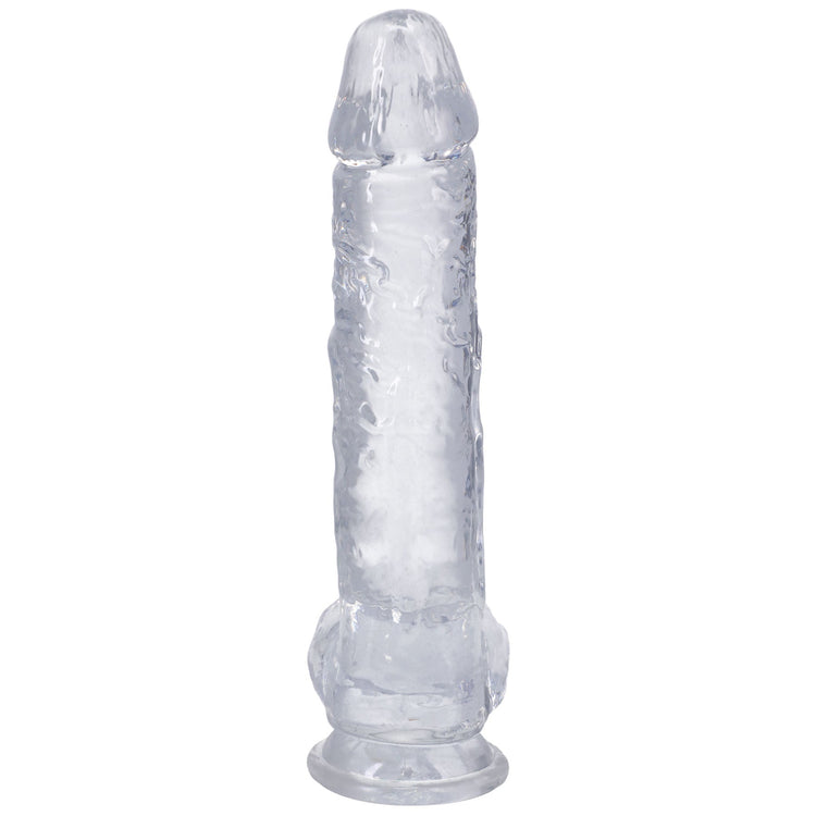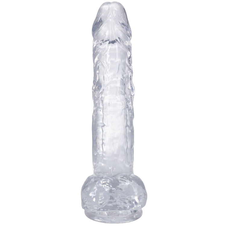 Satisfy your craving for size with this massive 10-inch cock. Its lifelike  phallic shape is complete with realistic veins, firm balls, and suction-cup base for hands-free play. Phthalate-Free and Body-Safe.
