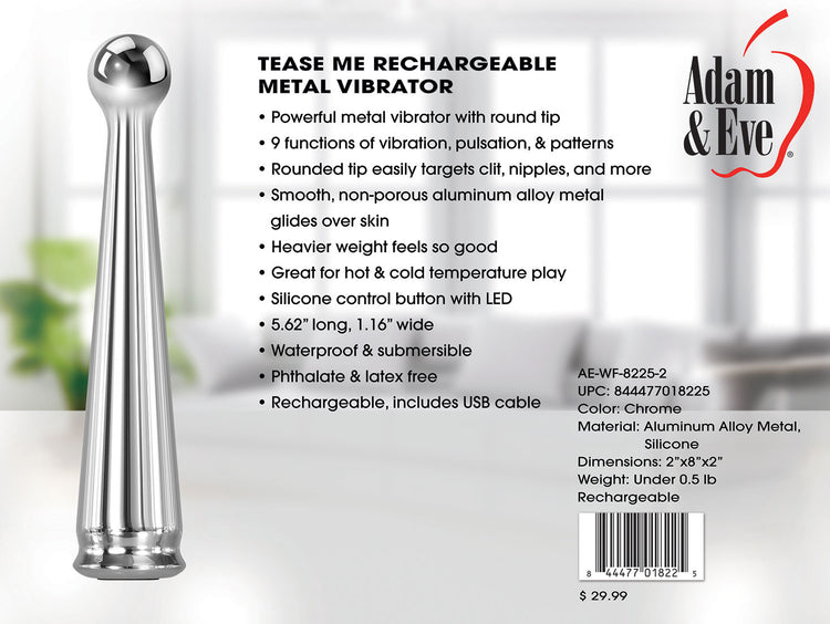 Tease every one of your body’s hot spots with slick, satisfying metal and toe-curling vibrations! Feel this wild rechargeable vibe’s 9 functions of mind-blowing vibration concentrated right in its round metal tip. Made from a body-safe aluminum alloy metal, it feels so firm and holds temperature for all sorts of erotic play.