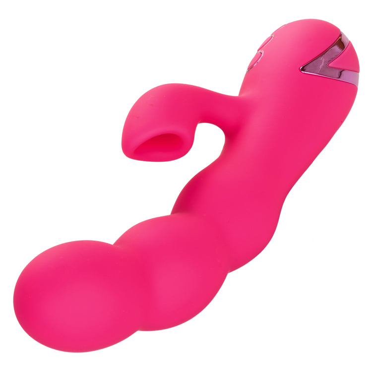 The playful California Dreaming Collection brings sunkissed fantasies to life with the marvelous Oceanside Orgasm. The uniquely designed massager is ready to relive your favorite summer fling fantasies with 10 powerful functions of clitoral suction and 3 knee-shaking vibration speeds. While the flickering vibrations work their magic, the full-coverage suction tip gives you knee- shaking suction stimulation. The stimulating encase has 10 functions of suction for wave after wave of orgasmic external stimulation. The shivering shaft of this ravishing rabbit uses an intense vibration motor for deeply satisfying internal stimulation. The flexible tickler vibrations can be used independently from the suction functions for truly customizable pleasure. The knee-shaking gyrations packed into this playful vibe aren't for the faint of heart! Triple power motors put out deep rumbling vibrations and powerful suction. Plug the provided USB cable into the self-healing charging port to recharge your passion in 2.5 hours. Thrill with up to 90 minutes of vibrating pleasure. To effortlessly control stimulation, the sleek 3-button control pad lets you independently operate the vibration and thumping options. The high-tech memory chip remembers just how you like it resumes play on the last function used.