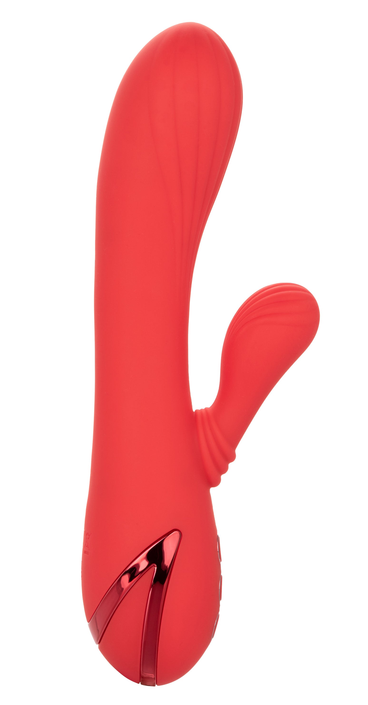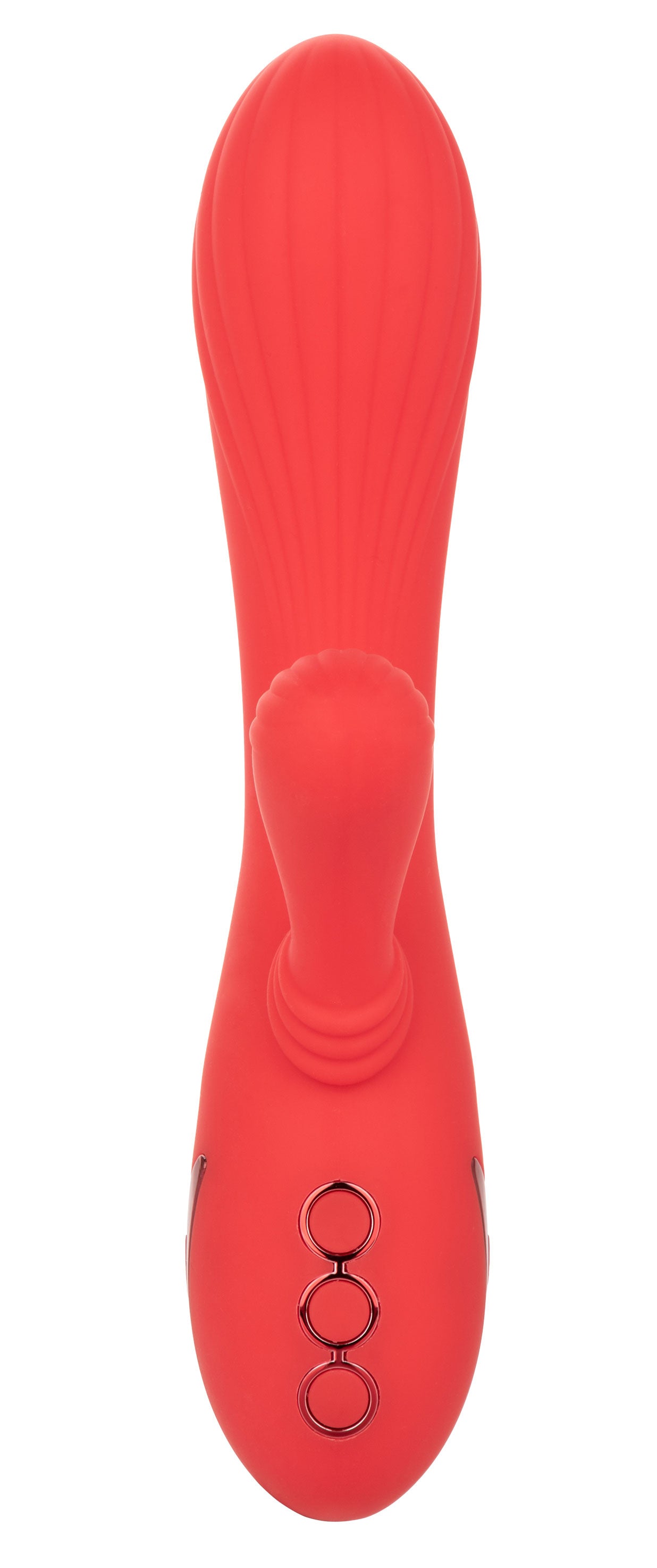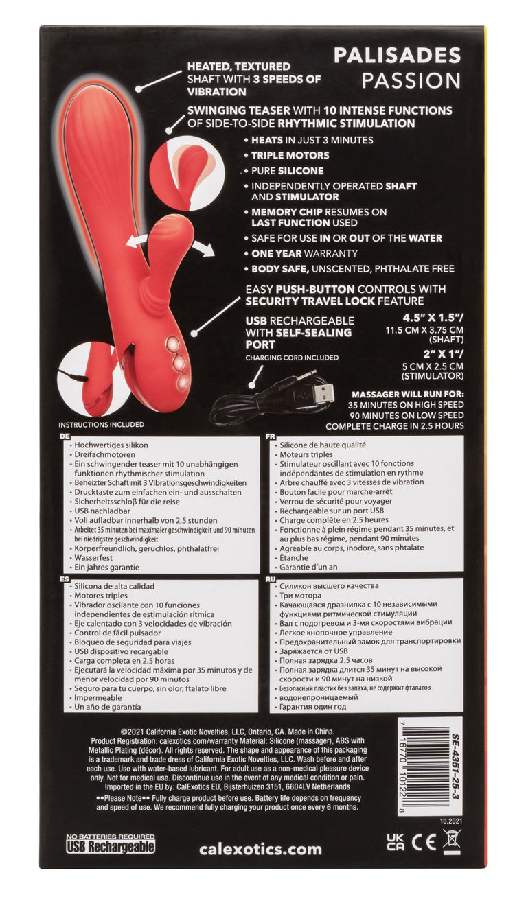 Give yourself over the your wildest fantasies and feel the heat rise with the red-hot California Dreaming Palisades Passion. Experience pleasure like never before with the unique swinging teaser and 3 speeds of shaft vibrations. The luxurious heated rabbit vibrator has a one-of-a-kind side-to-side rhythmic stimulator for mind-blowing external stimulation. Whether you're looking to turn up the heat with a lover or just enjoy some sensual solo time, this ravishing heated massager is ready. The incredible warming massager reaches a maximum soothing temperature in just 3 minutes for an indulgent good time. The rhythmic side-to-side teaser functions deliver show-stopping clitoral stimulation while the contoured shaft indulges with deep rumbling vibrators. Control and customize your pleasure play with the independently controlled vibration and stimulator functions. Recharge the massager in 2.5 hours with the provided USB charging cable to enjoy 45 minutes of high-speed stimulation or 90 minutes of low speed vibrations. Enjoy frustration-free control with the easy-touch 3-button control pad and security lock feature for travel-ready teasing. The virtually seamless body and self-sealing charging port allow you to get this versatile waterproof vibe for a dip. The hypoallergenic premium silicone is body safe, unscented and phthalate free to keep your most sensitive spots, happy and healthy.