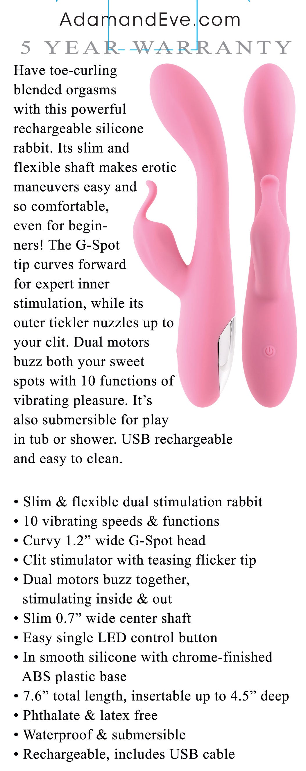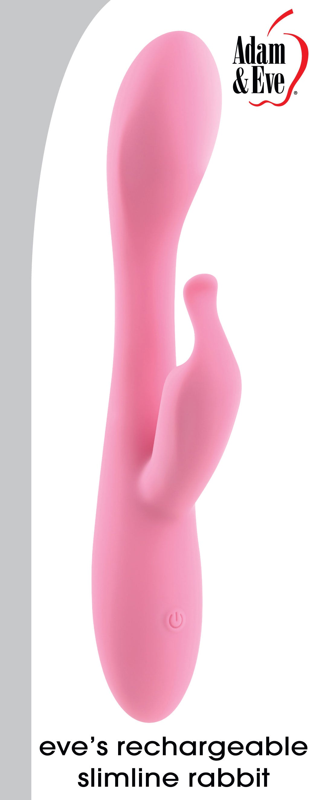 There are so many big, thick, oversized rabbits out there – but this super-sexy pink rabbit’s slim profile gives you the same awesome vibrating power while keeping play totally comfortable. Eve’s Rechargeable Slimline Rabbit is the perfect vibe for rabbit beginners as well as fans who prefer the easy reach of a slimmer toy. When you combine the best in G-Spot pleasure and clitoral magic, you get amazing body-shaking blended O’s. And Eve’s Rechargeable Slimline Rabbit is great at getting you there. Its curvy shaft goes deep to find and cuddle up to your G-Spot. The clitoral stimulator with flickering tip gets right up close and personal with your clit. One button activates the motors in both stimulators, sending awesome vibration to both your sweet spots at once. Explore speeds, pulsation, patterns, and more!