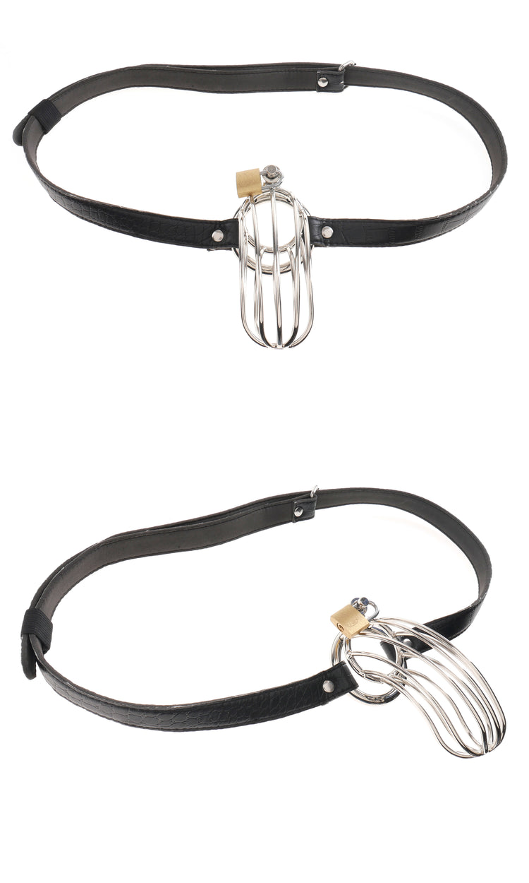 Punish your subjects misbehaved member with the Prisoners steel cock cage chastity belt. Made from high-polished steel and secured with lock and key this shiny chrome chastity cage will keep your subs cock behind bars until ypu decide to set it free. Dare your subject to get a hard on and watch as they struggle inside the prison-like confines of the cage. No matter how aroused he gets the curved steel shape prevents your sub from getting erect nut the open design still allows them the freedom to piss when they need to. You hold the key to pleasure so make sure they do as you say before you grant them in their freedom.