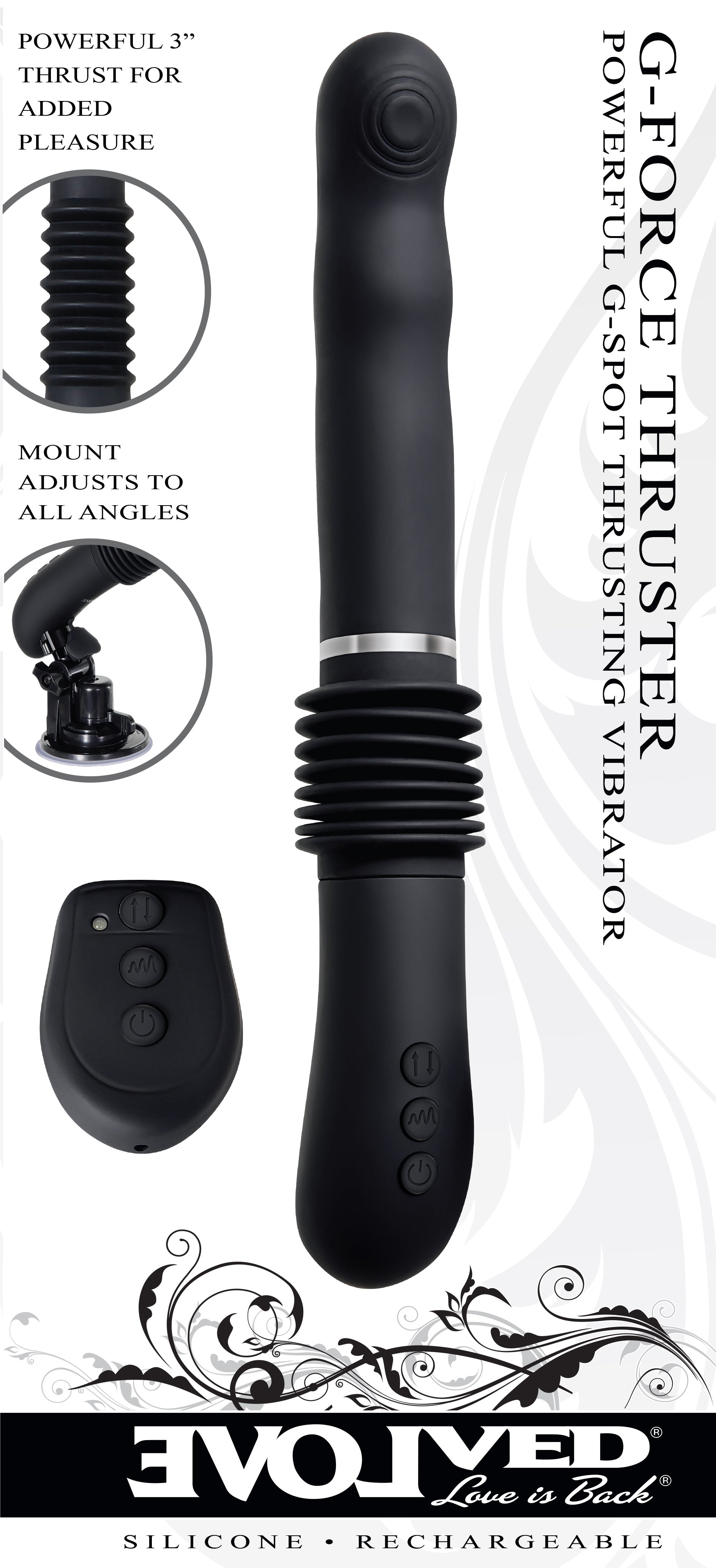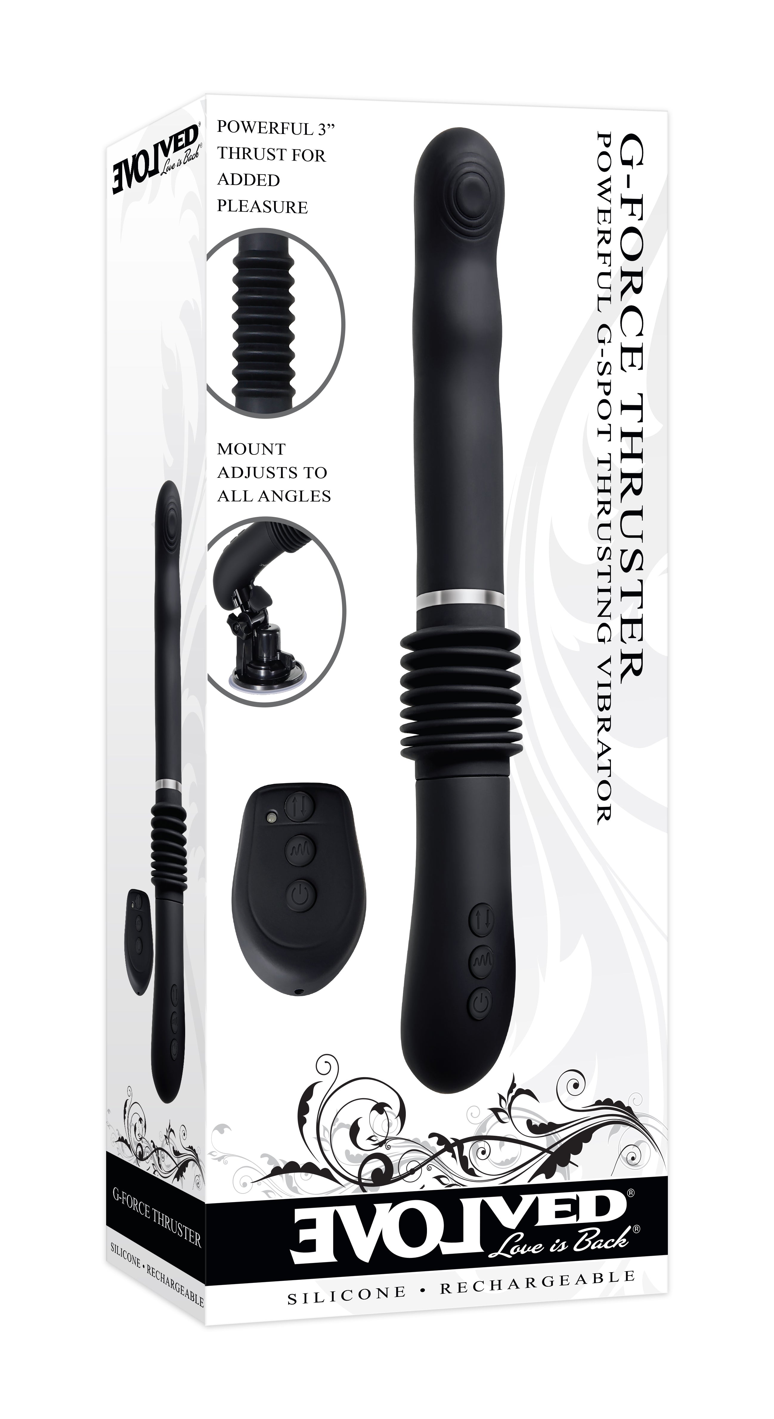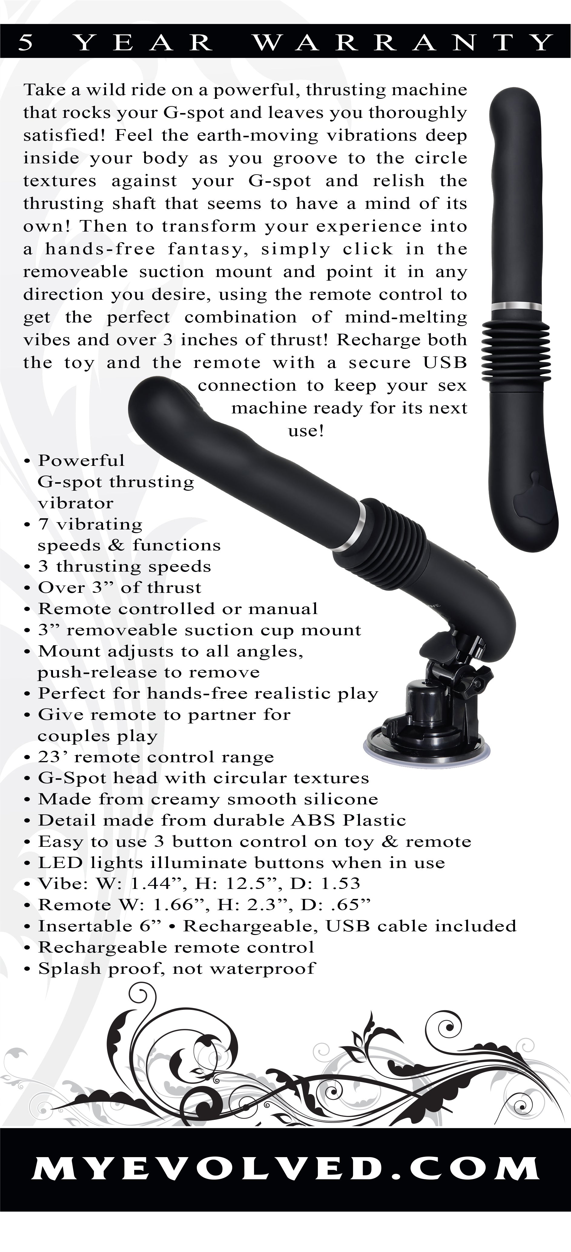 Take a wild ride on a powerful, thrusting machine that rocks your G-spot and leaves you thoroughly satisfied! Feel the earth-moving vibrations deep inside your body as you groove to the circle textures against your G-spot and relish the thrusting shaft that seems to have a mind of its own! Then to transform your experience into a hands-free fantasy, simply click in the removeable suction mount and point it in any direction you desire, using the remote control to get the perfect combination of mind-melting vibes and over 3 inches of thrust! Recharge both the toy and the remote with a secure USB connection to keep your sex machine ready for its next use!