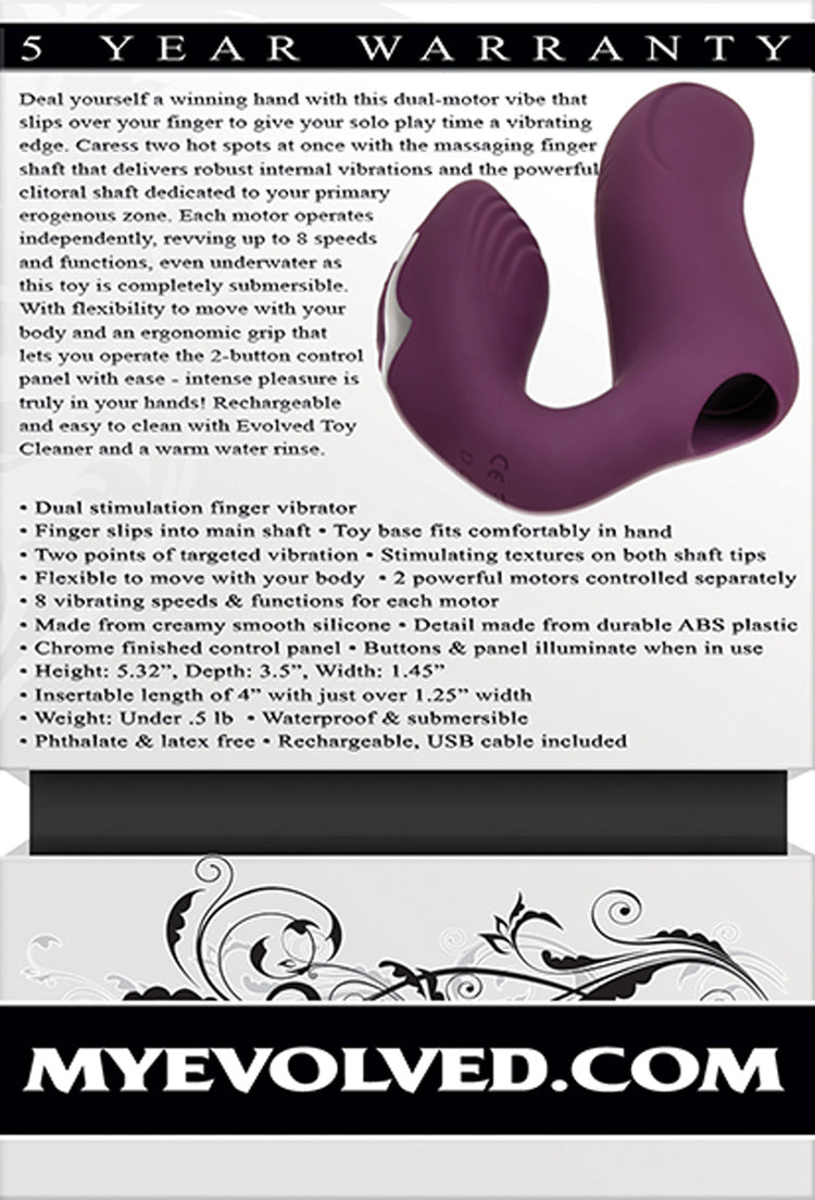 Deal yourself a winning hand with this dual-motor vibe that slips over your finger to give your solo play time a vibrating edge. Caress two hot spots at once with the massaging finger shaft that delivers robust internal vibrations and the powerful clitoral shaft dedicated to your primary erogenous zone. Each motor operates independently, revving up to 8 speeds and functions, even underwater as this toy is completely submersible. With flexibility to move with your body and an ergonomic grip that lets your operate the 2-button control panel with ease, intense pleasure is truly in your hands! Rechargeable and easy to clean with Evolved Toy cleaner and warm water rinse.