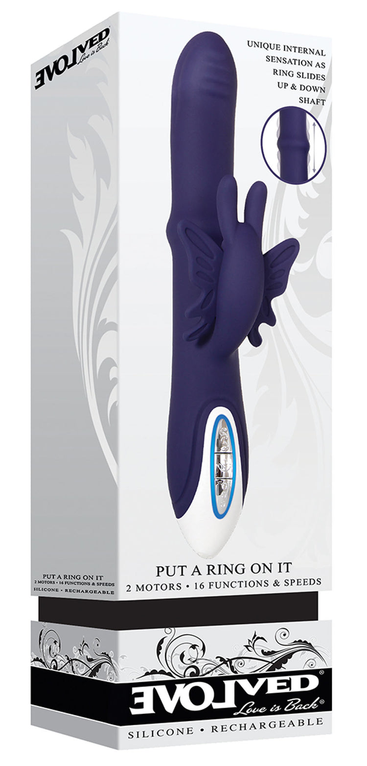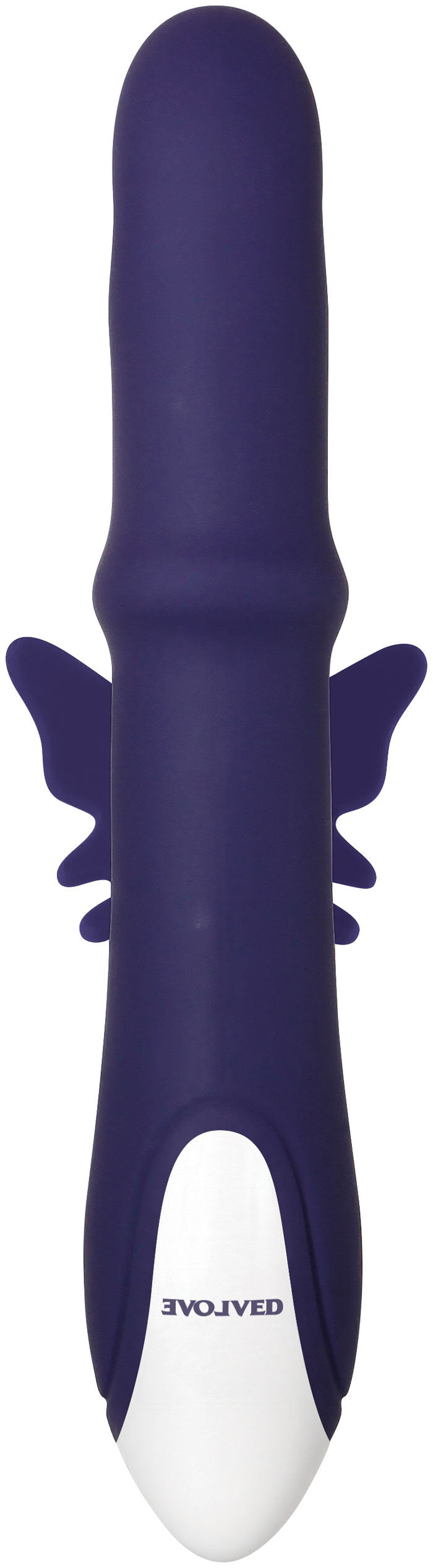 This playful vibe has an unusual feature that really gives women something to sing about! Aside from its girthy, lengthy size and widespread butterfly clitoral stimulator, this hard-working device boasts a ring that slides up and down the shaft in five different speeds! Women describe the internal sensation as positively exhilarating as the ring moves seamlessly underneath the creamy silicone from the bottom of the shaft up to just under the head. Meanwhile the butterfly shaped stimulator spans wide to energize far reaching clitoral nerves for indirect stimulation that creates a deeply satisfying climax.