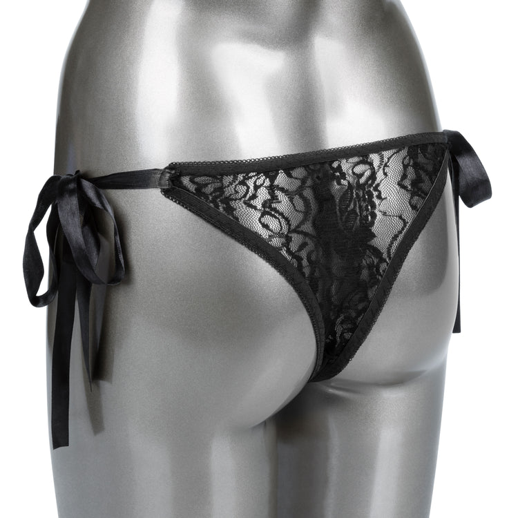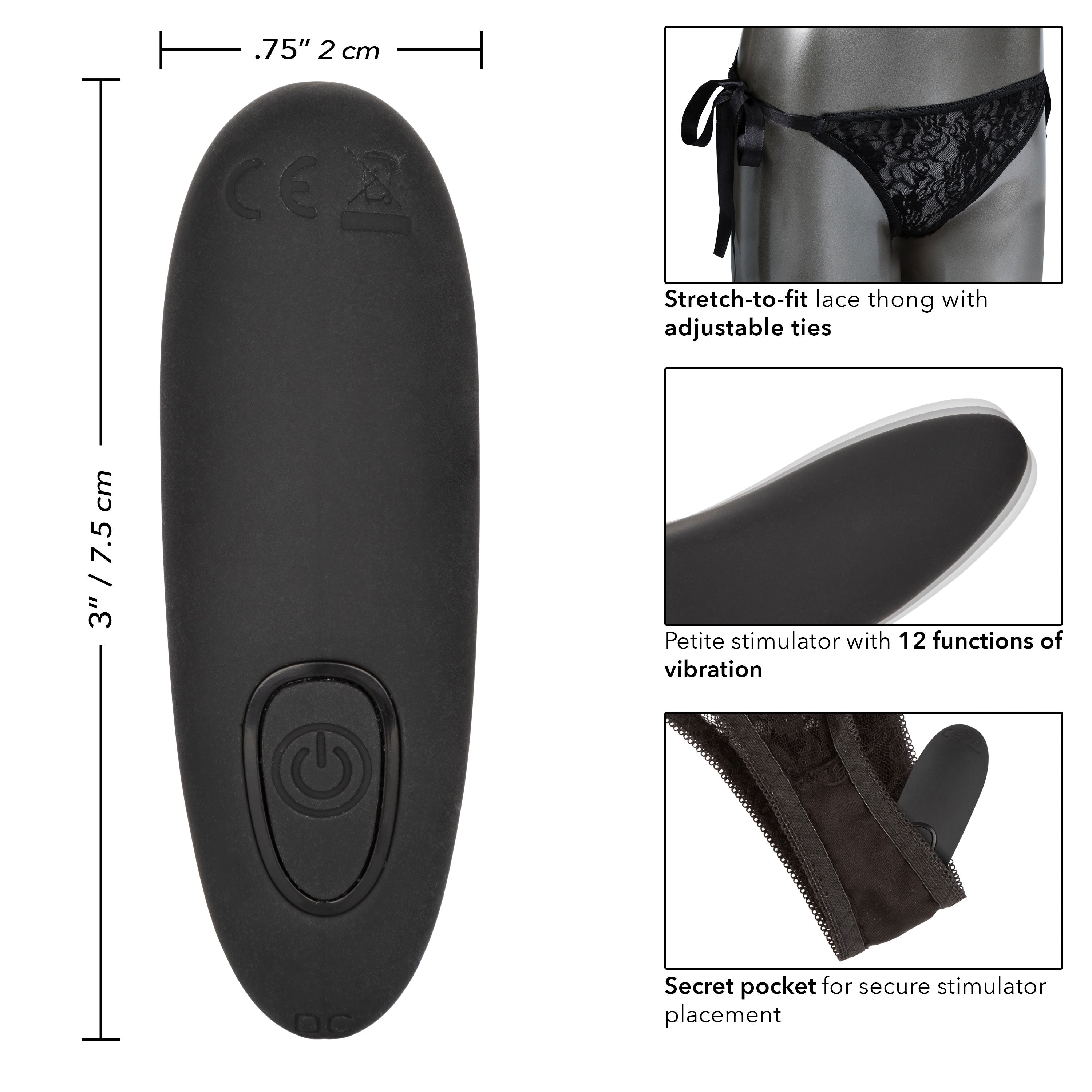 Indulge in your newest dirty little secret with the Remote Control Lace Thong Set. This sexy set includes a stretch-to-fit tie-on lace thong, curved panty teaser and a discreet remote control with a range of up to 32' (10m). Whenever or wherever passion takes you, this passionate mini vibrator's 12 intense functions of vibration are ready for playtime. The sexy and stretchy lace panties feature a satin side ties and a discreet internal pocket for the perfect stimulator pocket. Machine washable and oh-so comfortable, these vibrating panties are made for extended wear and adventurous playtime comfort.