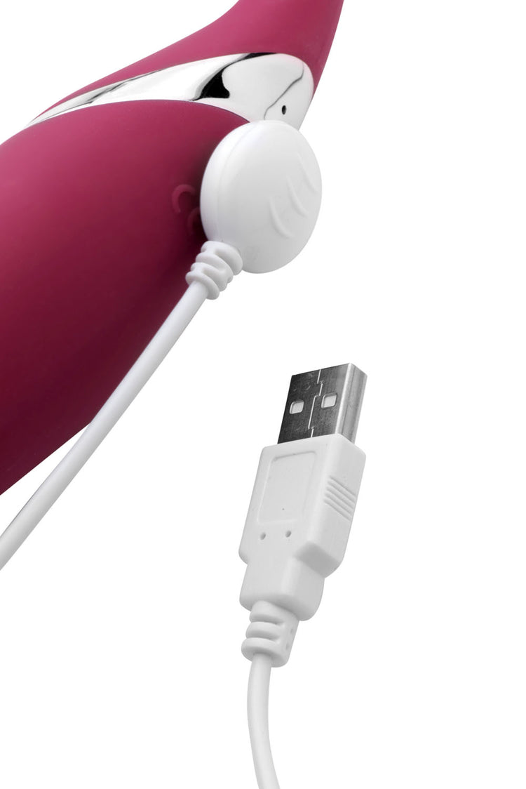 Intensify your orgasms with this double ended oral sex simulator and G-spot vibe! Both ends feature 12 different levels and patterns of power. The small end has incredible suction power that will take you past the brink of orgasmic ecstasy when you place it around your clitoris, or even a nipple! This revolutionary feature is unrivaled, with sucking pressure that is strong and effective. The handle end is smooth for a comfortable penetration, with a curve that will target your G-spot upon insertion. The powerful vibrating shaft will also feel unbelievable externally. Made of premium silicone, this double-ended pleasure tool is non-porous and phthalate-free. Clean with mild soap and warm water and avoid use with silicone lubricants.