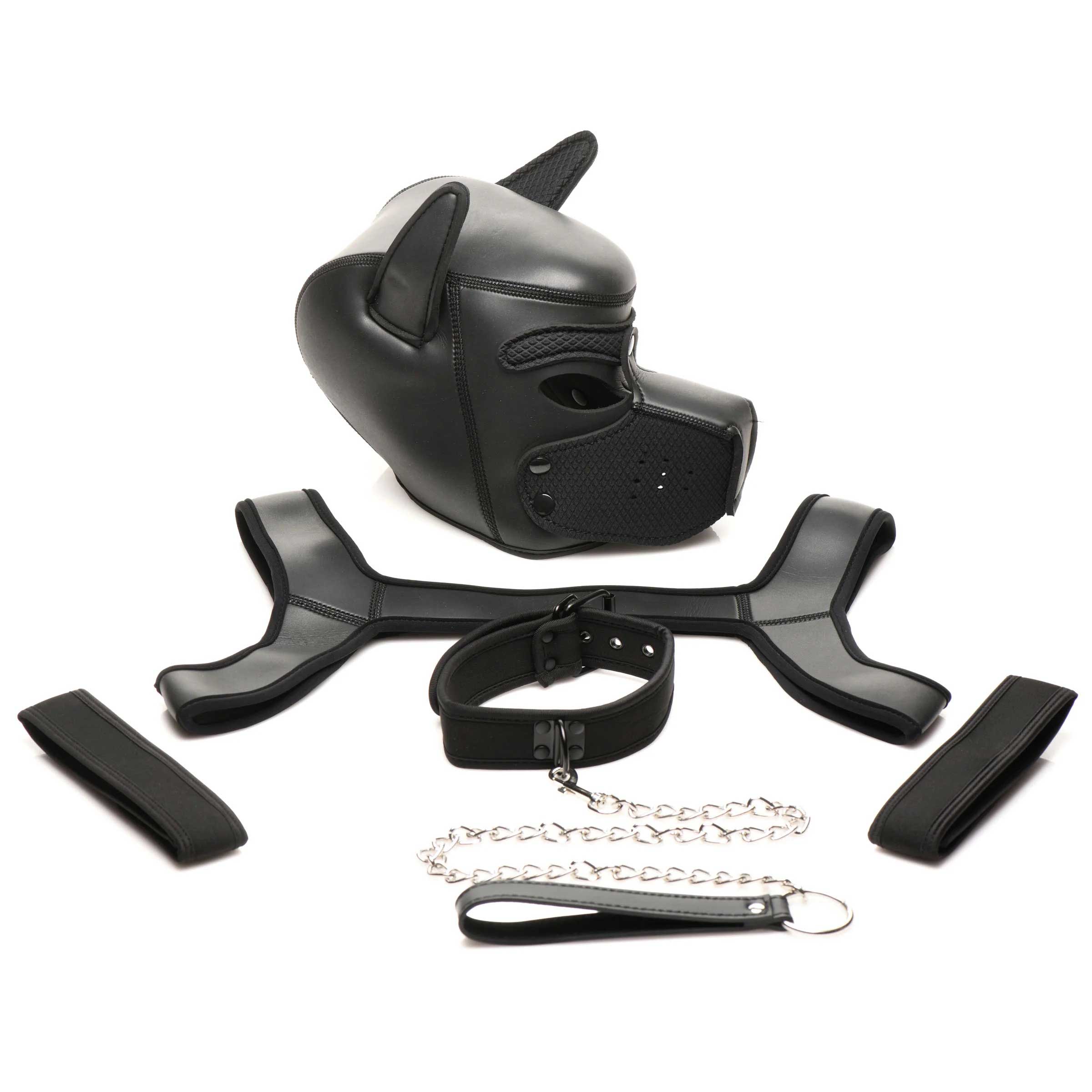 When playing as a puppy, the right gear goes a long way! Get everything you need to get started in one kit and live out your fantasy! Included in the kit is a puppy hood, collar and leash, arm bands and a chest harness. Made out of durable neoprene, this gear is vegan-friendly, easy to clean if you start wrestling and playing in the mud or getting dirty, and comfortable to wear! The puppy hood has poseable ears and a removable muzzle. Point your ears in different ways to show off your mood or personality. Remove you muzzle to use your human mouth when you want to or need to. The armbands and collar are adjustable for a custom fit. The chest harness fits most bodies. Spot clean as needed. Store out of direct sunlight.