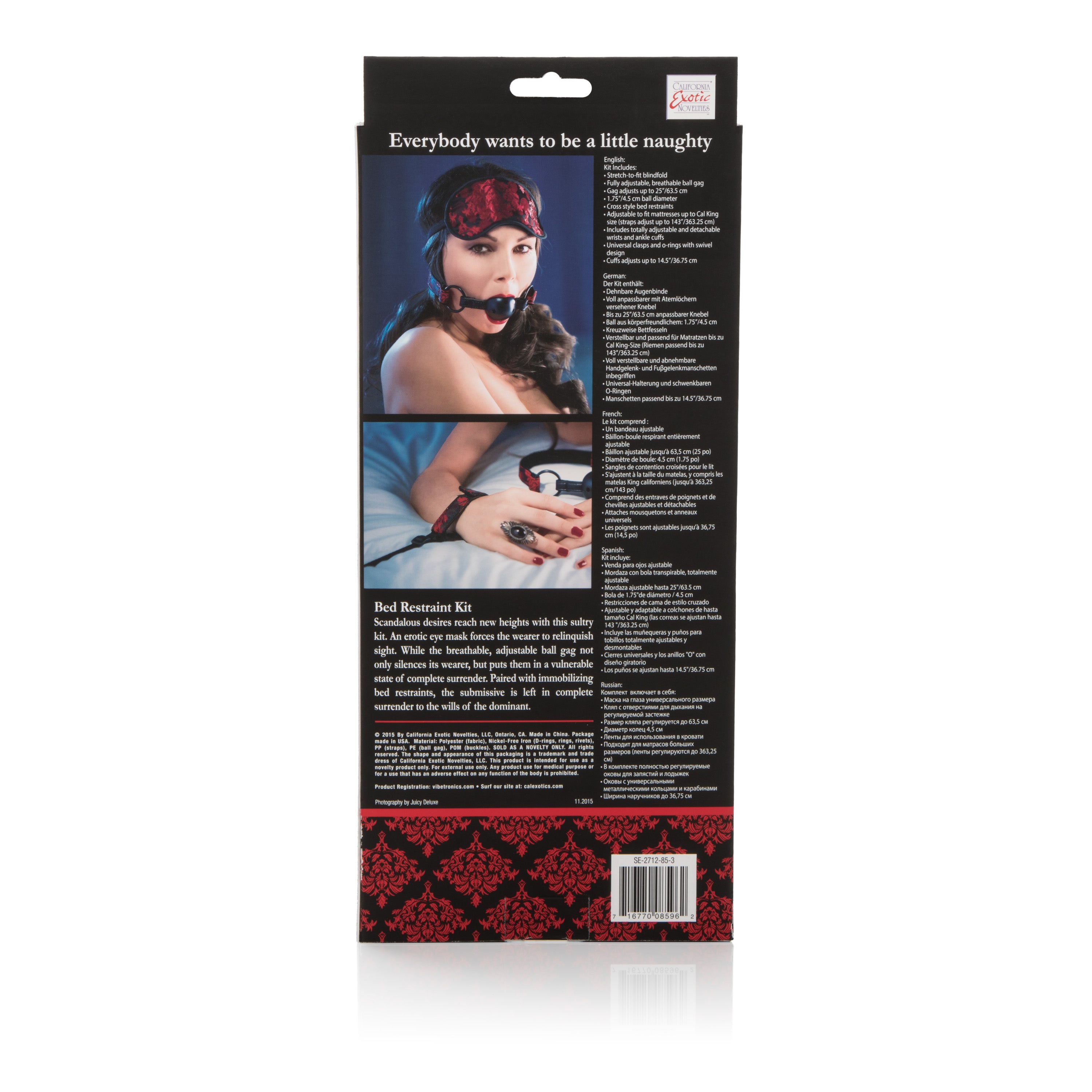 Scandalous desires reach new heights with this sultry kit. An erotic eye mask forces the wearer to relinquish sight. While the breathable, adjustable ball gag not only silences its wearer, but puts them in a vulnerable state of complete surrender. Paired with immobilizing bed restraints, the submissive is left in complete surrender to the wills of the dominant.