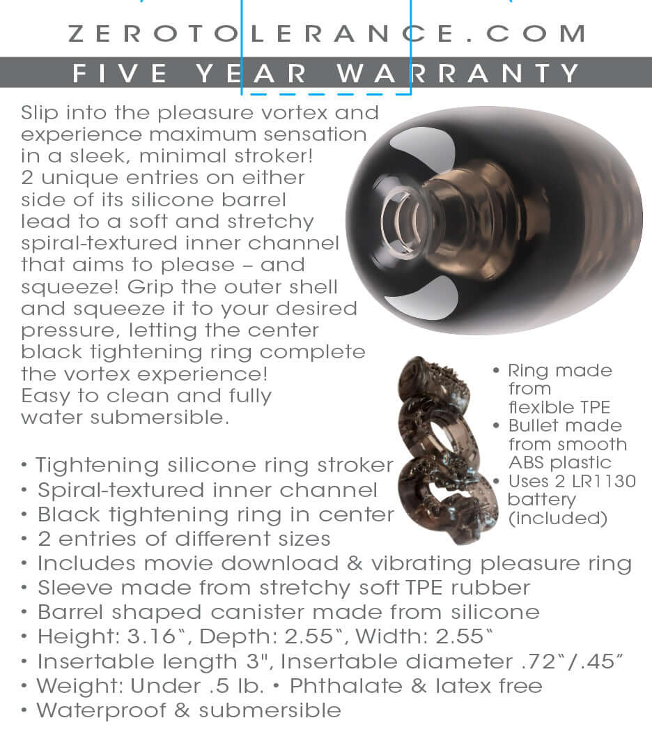 Slip into the pleasure vortex and experience maximum sensation in a sleek, minimal stroker! 2 unique entries on either side of its silicone barrel lead to a soft and stretchy spiral-textured inner channel that aims to please – and squeeze! Grip the outer shell and squeeze it to your desired pressure, letting the center black tightening ring complete the vortex experience! Easy to clean and fully water submersible. Includes pleasure ring for maximum sensation.