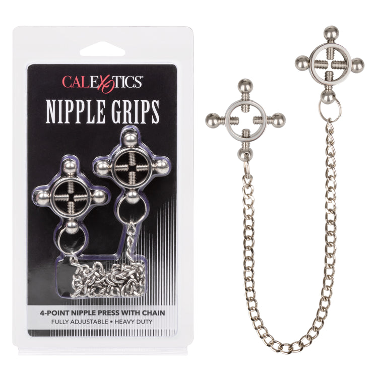 Push sensation to the next level and enjoy teasing nipple play with the Nipple Grips 4-Point Nipple Press with Chain. Explore elevated sensation with the 2 fully adjustable multi use clamps, screw down 4-point press, and teasing chain. Reach new levels of playful pleasure in the screw-down 4-point press with fully adjustable screws. Clamp the naughty clasps to the nipple or anywhere on the body and enjoy every rush of pain and pleasure.