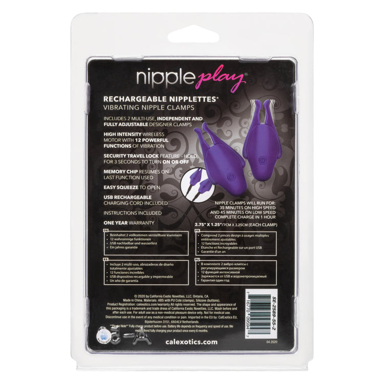Blur the borders between pleasure and pain even further with the game-changing Nipple Play® Rechargeable Nipplettes®. This daring designer nipple clamp set features 12 independently controlled functions of vibration, fully adjustable clamps and USB rechargeable battery. Clamp these multi-use teasers to your body and enjoy every rush of stimulation as you flicker through the powerful functions of vibration at the touch of a button. As the tension tightens, the tingles intensify with every touch of the button for the ultimate in nipple stimulation toys.