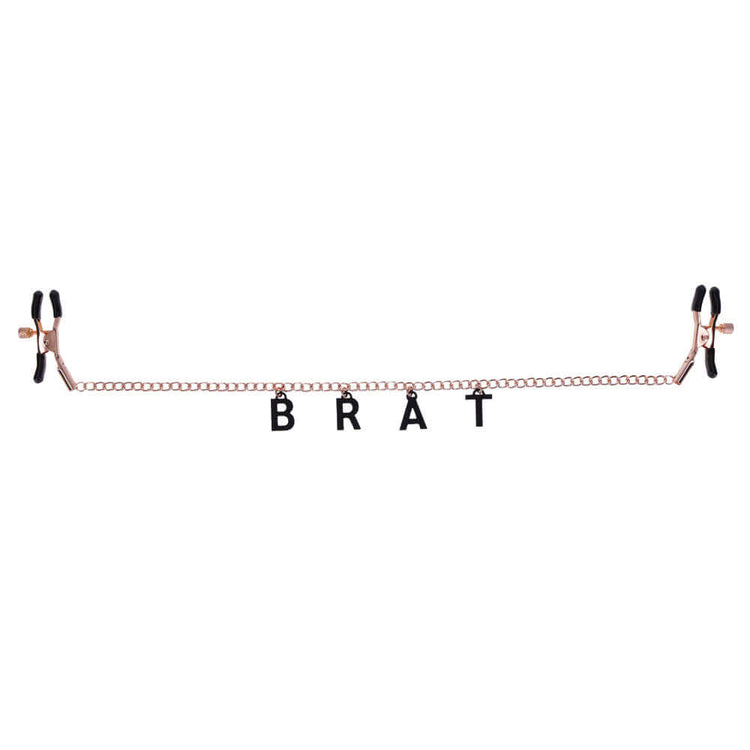Embrace your brattiest attributes and proudly display your naughtiness with the Brat Charmed Nipple Clamps! Adjust the tension and explore pleasure at every intensity with the rubber tipped, rose gold chained nipple clamps. Own every teasing quality you love with the black charms stretched across the chain labeling you for what you love to be, a BRAT
