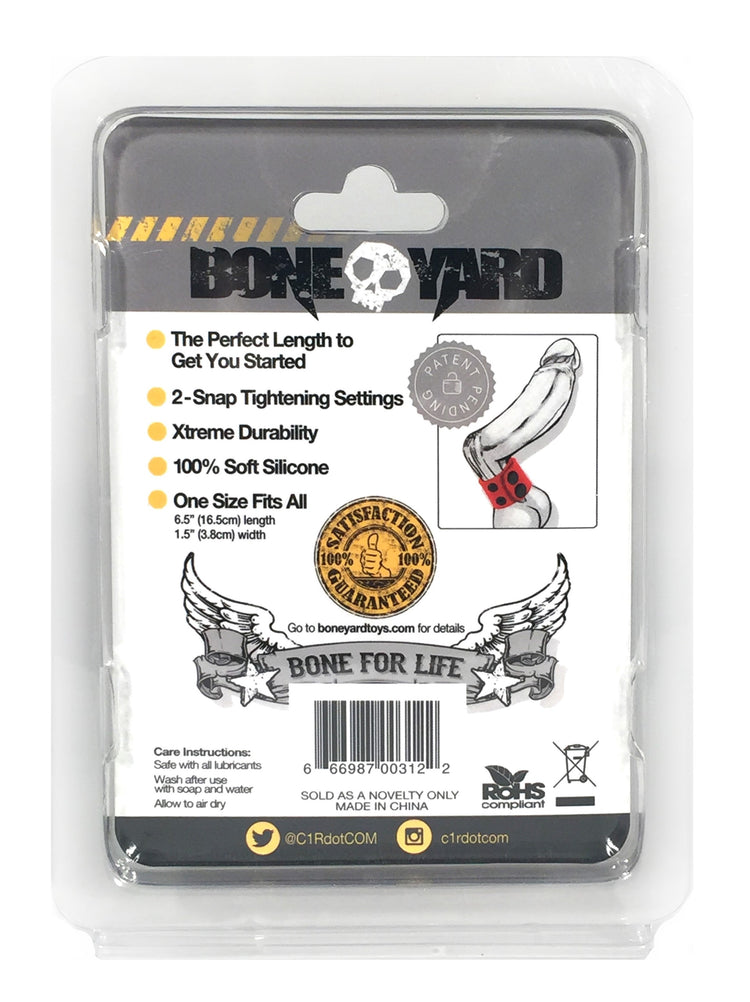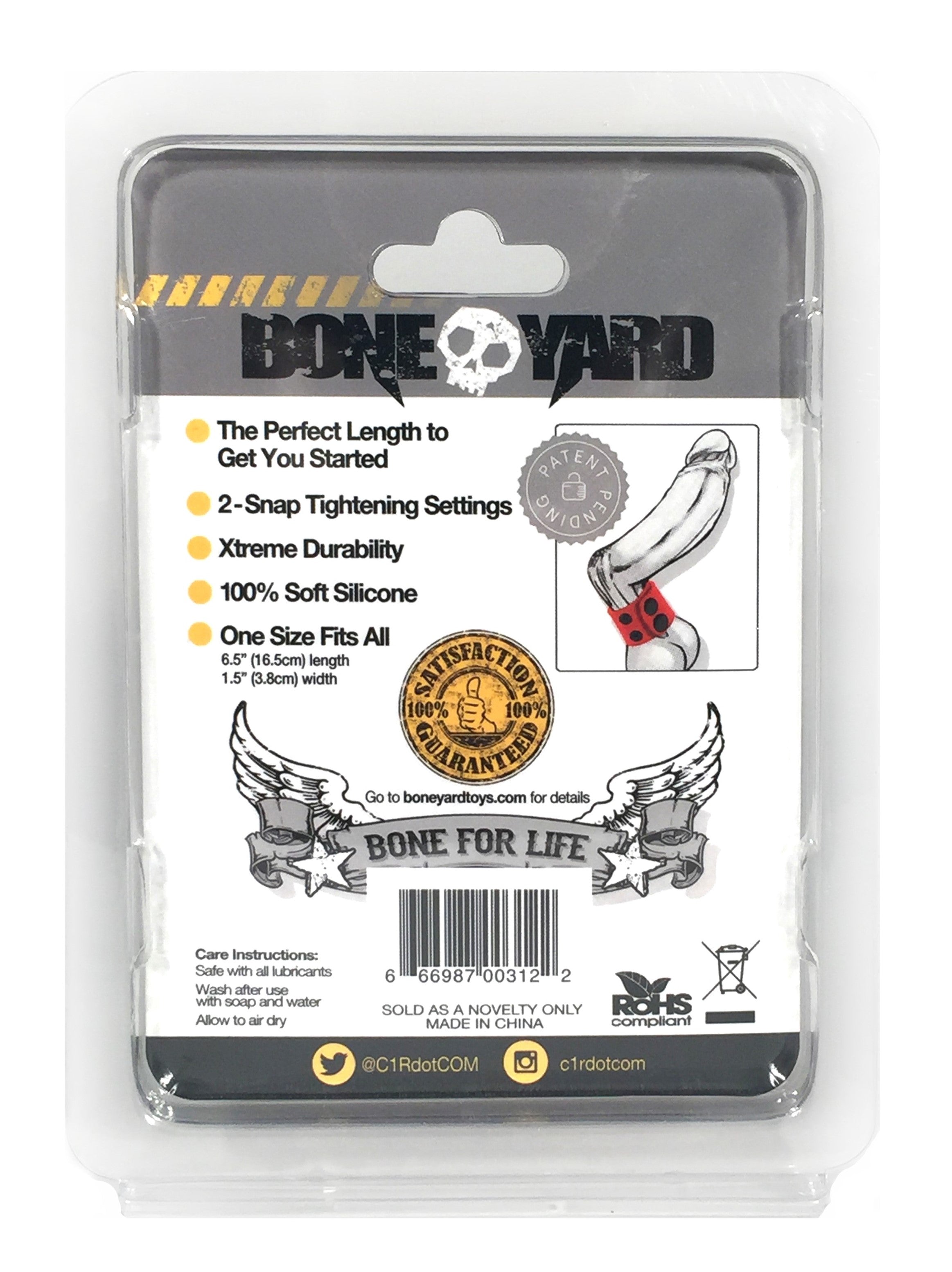 These must-have man toys are designed with superior materials and production thus increasing both comfort and lifespan. The powerful and iconic Boneyard-branded design has a sleek soft touch silicone finish and features a superior and durable stretch. The medical grade 100% silicone snap ball stretchers come with 3 snaps on one end and 1 on the other, giving the wearer 3 sizing options to find the correct size.
