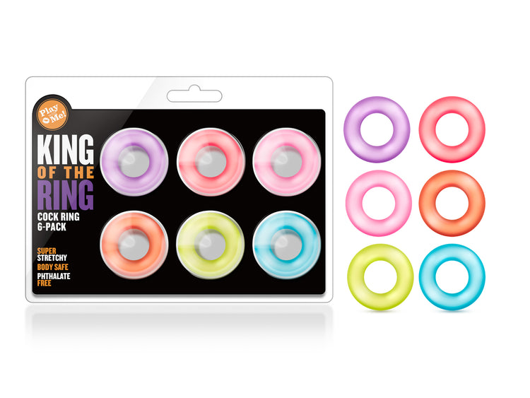 Play hard and increase your stamina with your King of the Ring six pack! These rings are a simple way to feel harder, bigger and prolong your play! King of the Ring provides amazing benefits as these can be used around the shaft or both the shaft and testicles. Made of super stretchy elastomer. Easy to clean and good to go again and again-- just like you!