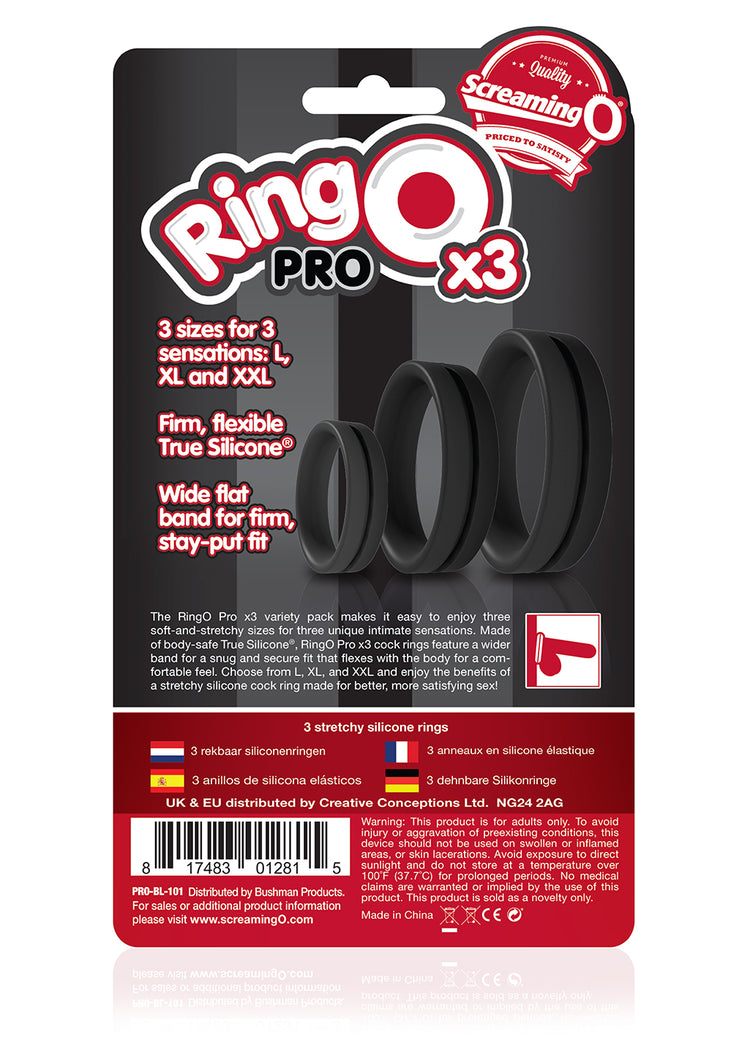 The RingO Pro x3 variety pack makes it easy to enjoy three soft-and-stretchy sizes for three unique intimate sensations. Made of body-safe True Silicone, RingO Pro x3 cock rings feature a wider band for a snug and secure fit that flexes with the body for a comfortable feel. Choose from L, XL, and XXL and enjoy the benefits of a stretchy silicone cock ring made for better, more satisfying sex!