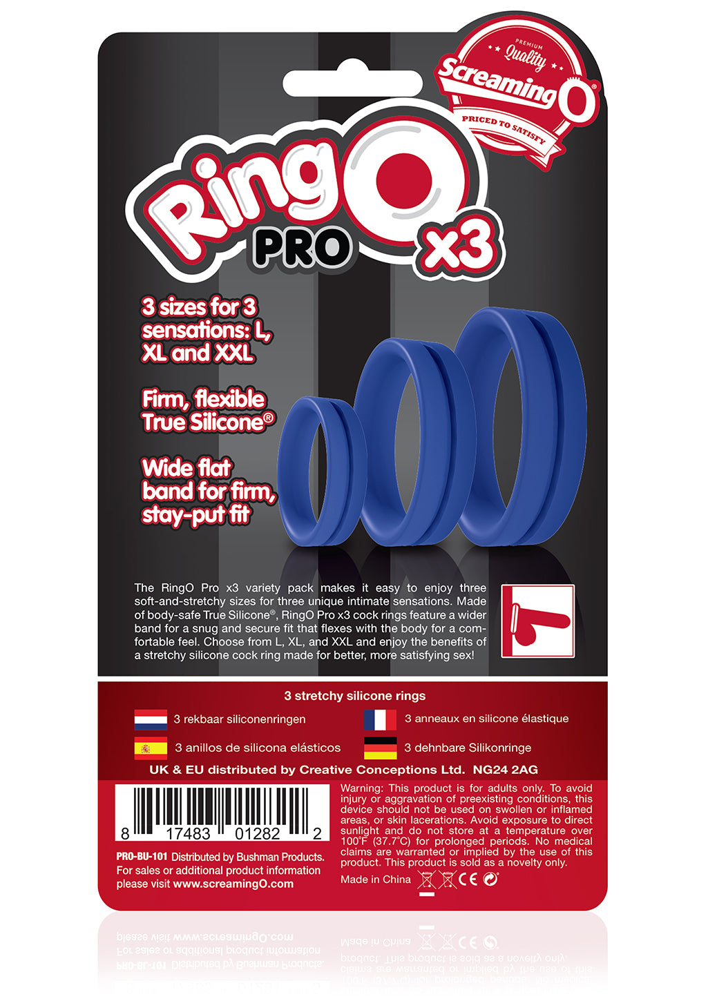 The RingO Pro x3 variety pack makes it easy to enjoy three soft-and-stretchy sizes for three unique intimate sensations. Made of body-safe True Silicone, RingO Pro x3 cock rings feature a wider band for a snug and secure fit that flexes with the body for a comfortable feel. Choose from L, XL, and XXL and enjoy the benefits of a stretchy silicone cock ring made for better, more satisfying sex!