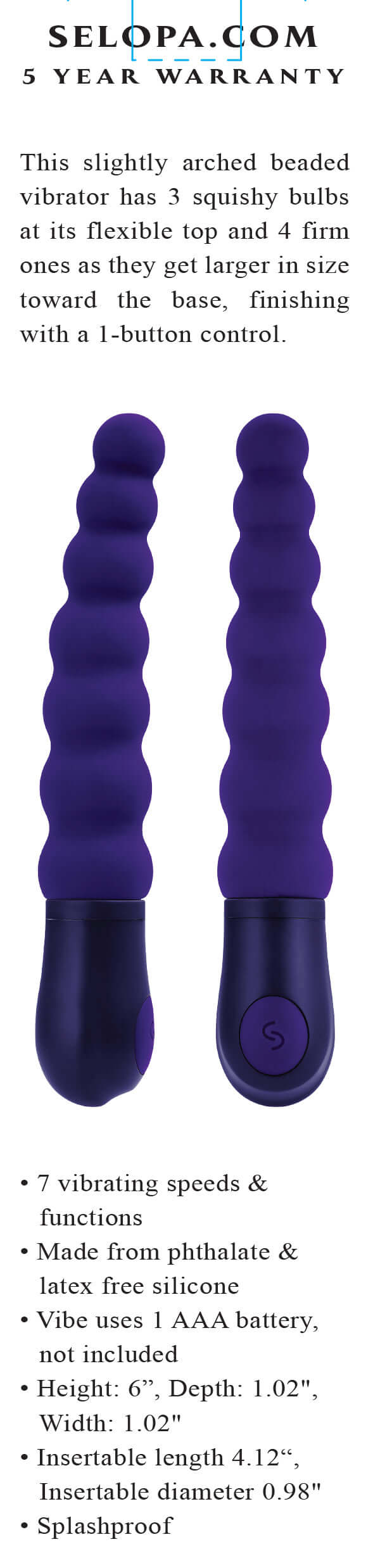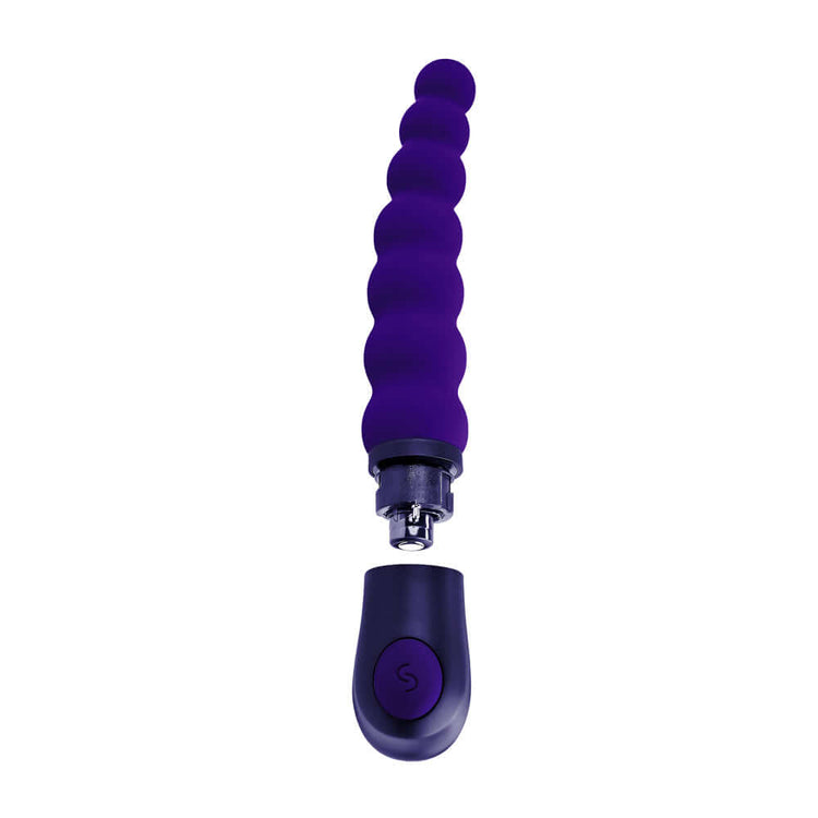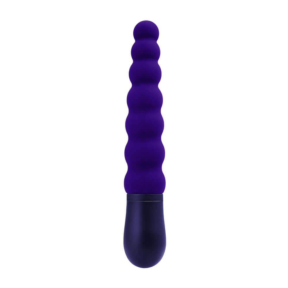 This slightly arched beaded vibrator has 3 squishy bulbs at its flexible top and 4 firm ones as they get larger in size toward the base, finishing with a 1 -button control.