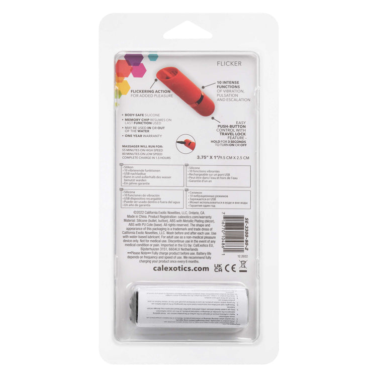 No matter where your travels take you, enjoy a little "me time" with the Kyst Flicker mini massager. The powerful mini silicone bullet is packed with 10 functions of vibration, a memory chip, and a flickering tongue tip. The mini massager fits between your fingers to let you deliver pinpoint tantalization and thrill with rumbling vibrations and a flickering tongue. Get playful while you cycle through 10 indulgent vibration, pulsation and escalation functions with the easy-touch control button.