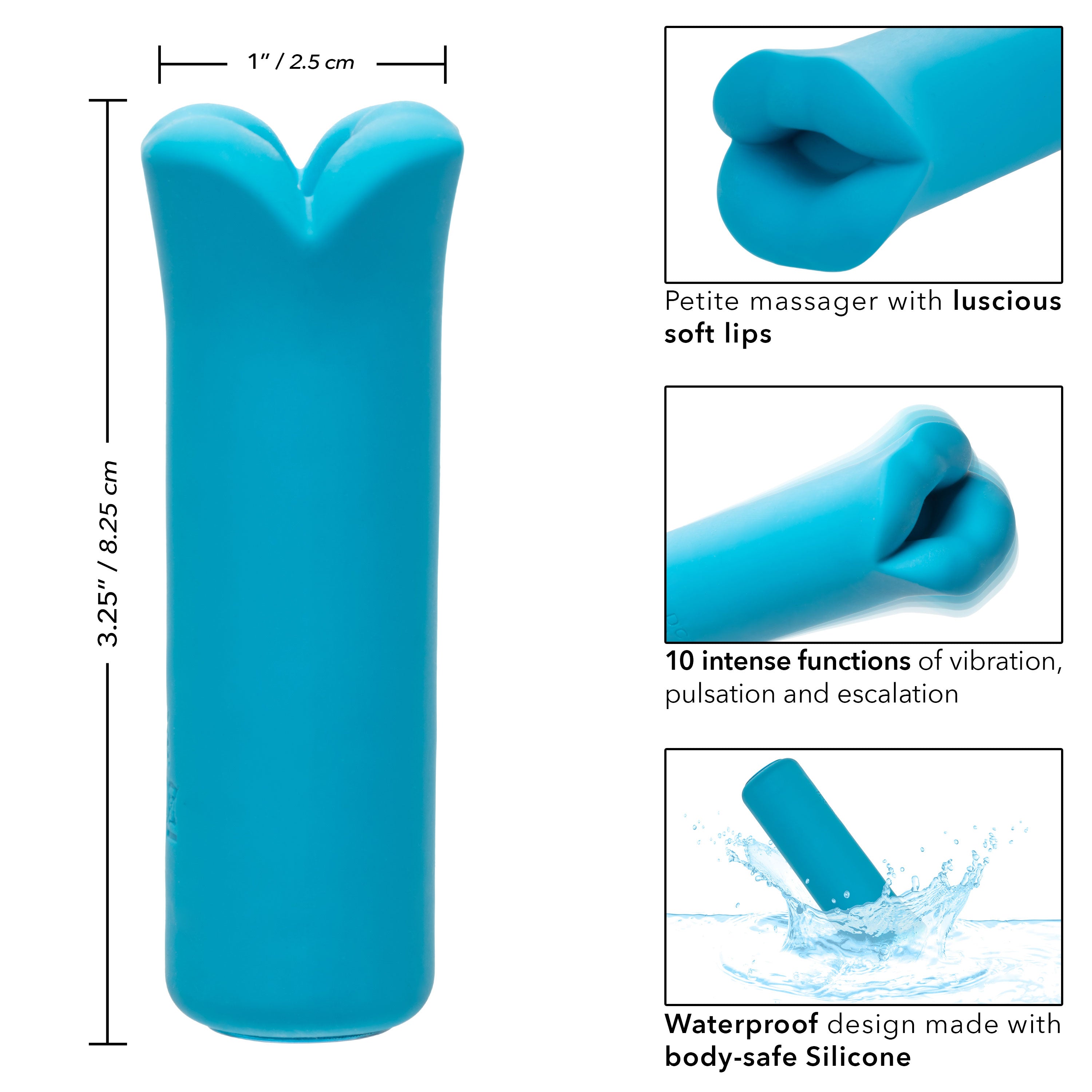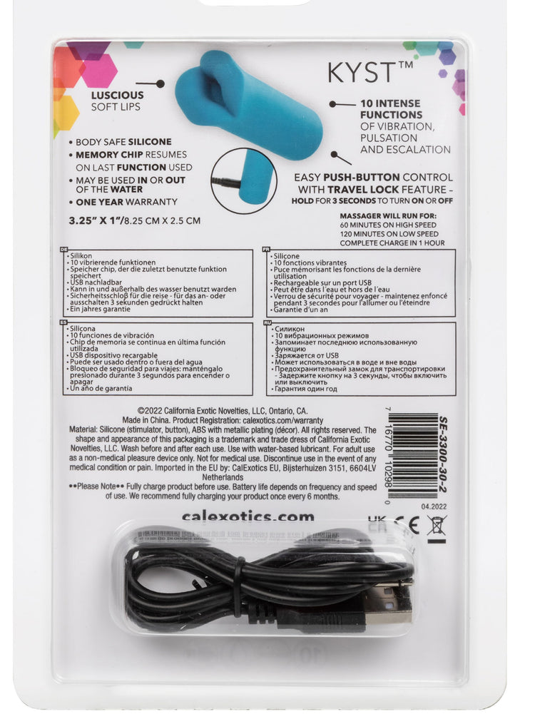 No matter where your travels take you, enjoy a little me time with the Kyst Lips mini massager. The powerful mini silicone bullet is packed with 10 functions of vibration and luscious, pliable lips. The mini massager fits between your fingers to let you deliver pinpoint tantalization and a thrilling kiss with rumbling vibrations. Get playful while you cycle through 10 indulgent vibration, pulsation and escalation functions with the easy-touch control button. The premium silicone and plushy soft lips are great for exploring sensual sweet spots and intimate pleasure points with ease. With a smooth shape and supple surface, you'll be able to indulge in thrilling vibrations from any angle your desire. Charge up your passion in just 1 hour by plugging the provided USB cable into the self-sealing charging port on the base of the massager. Get playful with up to 120 minutes of vibrations with every charge. The slim massager's discreet size makes it the perfect travel companion, letting you embrace radiating pleasure wherever your fantasies take you.