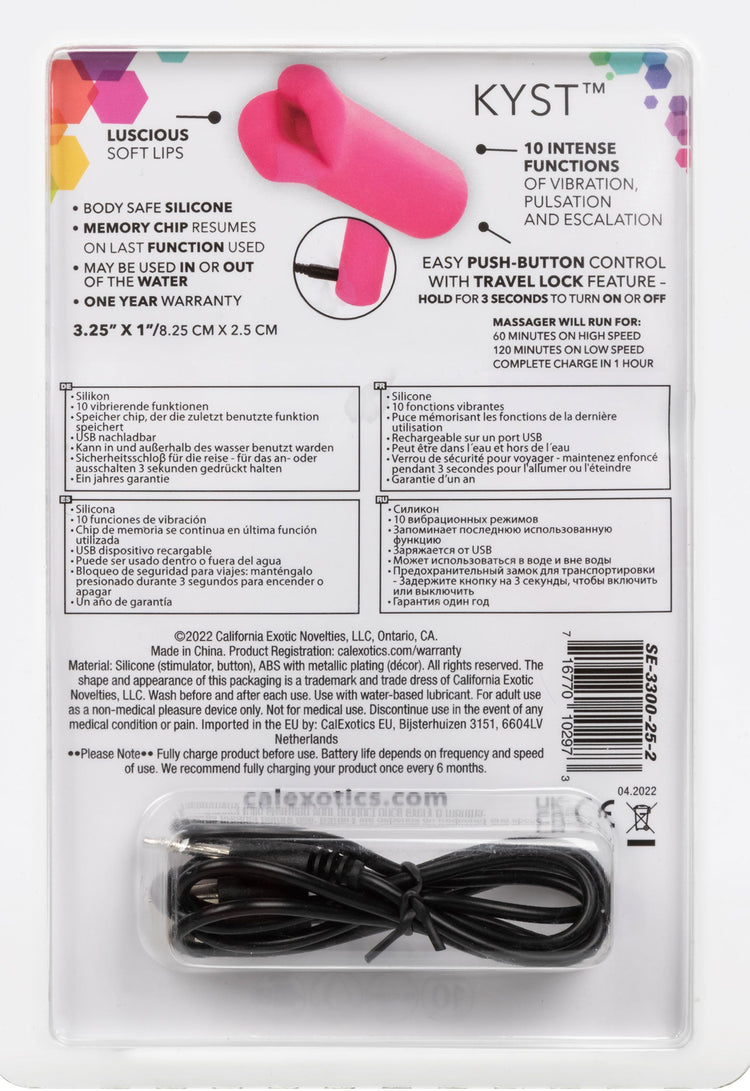 No matter where your travels take you, enjoy a little me time with the Kyst Lips mini massager. The powerful mini silicone bullet is packed with 10 functions of vibration and luscious, pliable lips. The mini massager fits between your fingers to let you deliver pinpoint tantalization and a thrilling kiss with rumbling vibrations. Get playful while you cycle through 10 indulgent vibration, pulsation and escalation functions with the easy-touch control button. The premium silicone and plushy soft lips are great for exploring sensual sweet spots and intimate pleasure points with ease. With a smooth shape and supple surface, you'll be able to indulge in thrilling vibrations from any angle your desire. Charge up your passion in just 1 hour by plugging the provided USB cable into the self-sealing charging port on the base of the massager. Get playful with up to 120 minutes of vibrations with every charge. The slim massager's discreet size makes it the perfect travel companion, letting you embrace radiating pleasure wherever your fantasies take you.