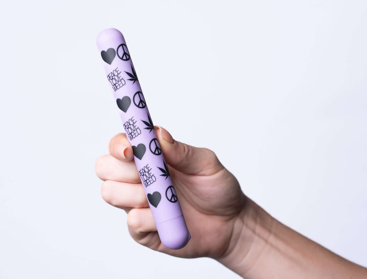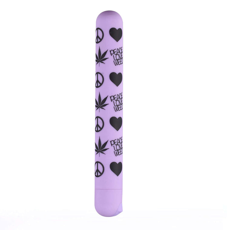 PEACE, LOVE and WEED. The Maia Novelties Unity makes a timeless statement with its modern design and nostalgic look. This 10-Function Rechargeable Bullet Vibrator is coated with silky soft Silicone that is 100% body safe. The PEACE, LOVE and WEED print design belies a soft yet powerful motor. The long, slender design allows for easy handling and multiple uses while the end position control button allows for easy speed change. The Unity can also be used for bath time highs with its 100% submersible design.