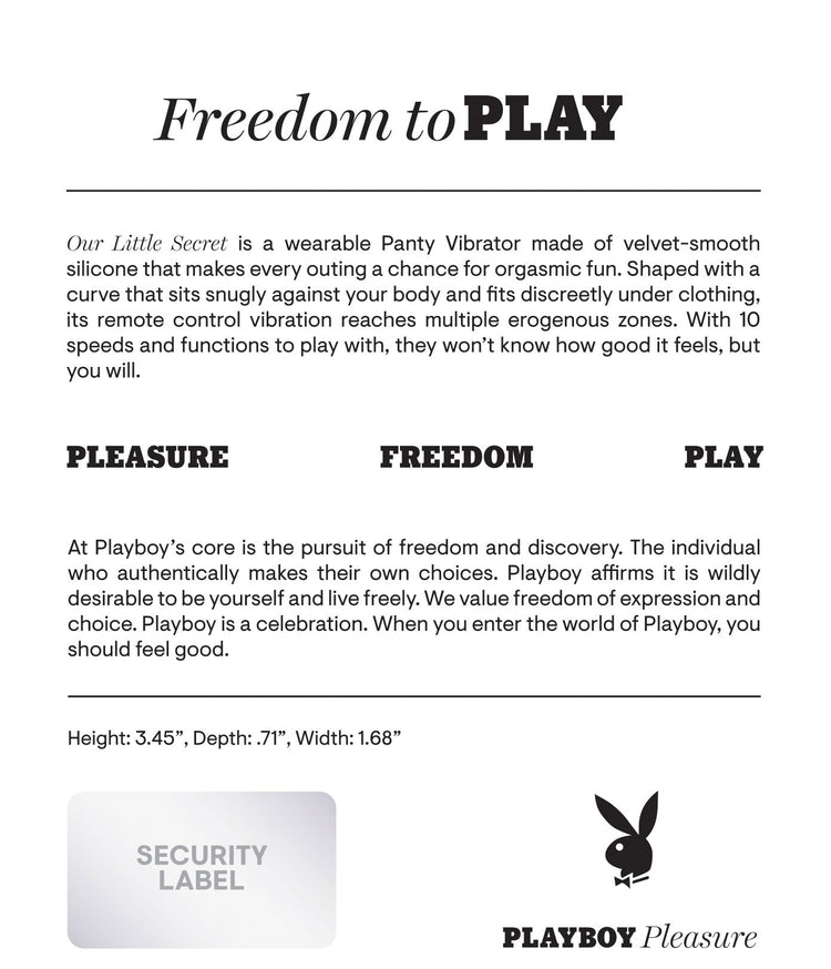 Our Little Secret is a wearable Panty Vibrator made of velvet-smooth silicone that makes every outing a chance for orgasmic fun. Shaped with a curve that  sits snugly against your body and fits discreetly under clothing, its remote  controls vibrations reaches multiple erogenous zones. With 10 speeds and  functions to play with, they won't know how good it feels, but you will.
