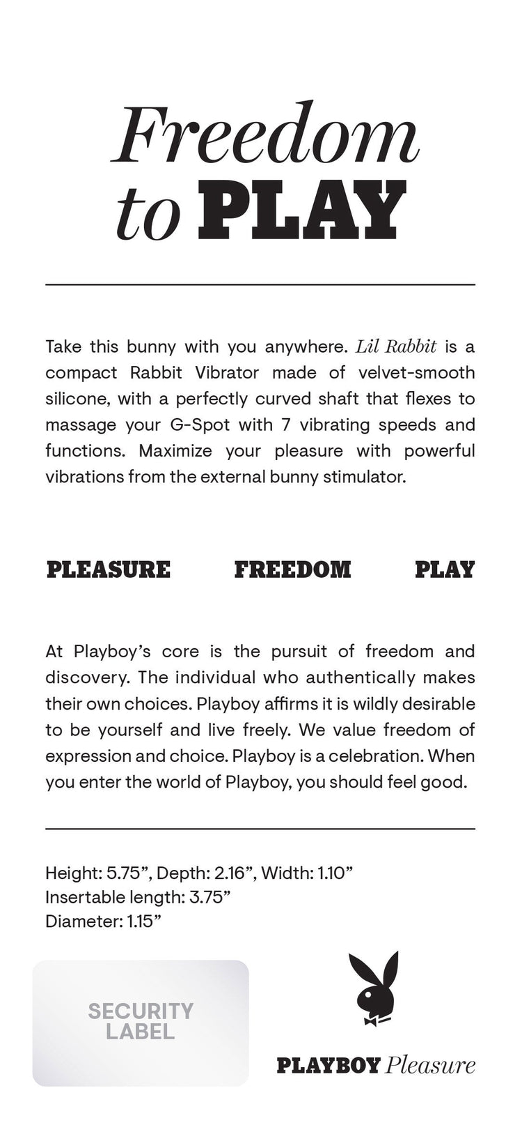 Take this bunny with you anywhere. Lil Rabbit is a compact Rabbit Vibrator made of velvet-smooth silicone, with a perfectly curved shaft that flexes to massage your G-Spot with 7 vibrating speeds and functions. Maximize your pleasure with powerful vibrations from the external bunny stimulator.