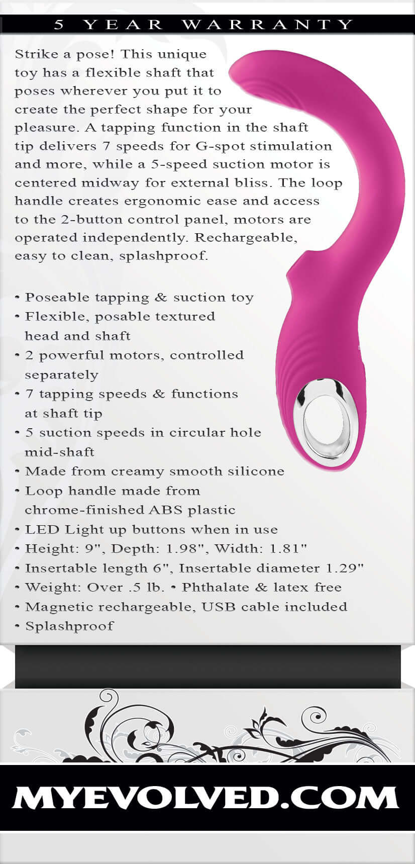 Strike a pose! This unique toy has a flexible shaft that poses wherever you put it to create the perfect shape for your pleasure. A tapping function in the shaft tip delivers 7 speeds for G-spot stimulation and more, while a 5-speed suction motor is centered midway for external bliss. The loop handle creates ergonomic ease and access to the 2-button control panel, motors are operated independently. Rechargeable, easy to clean, splashproof.