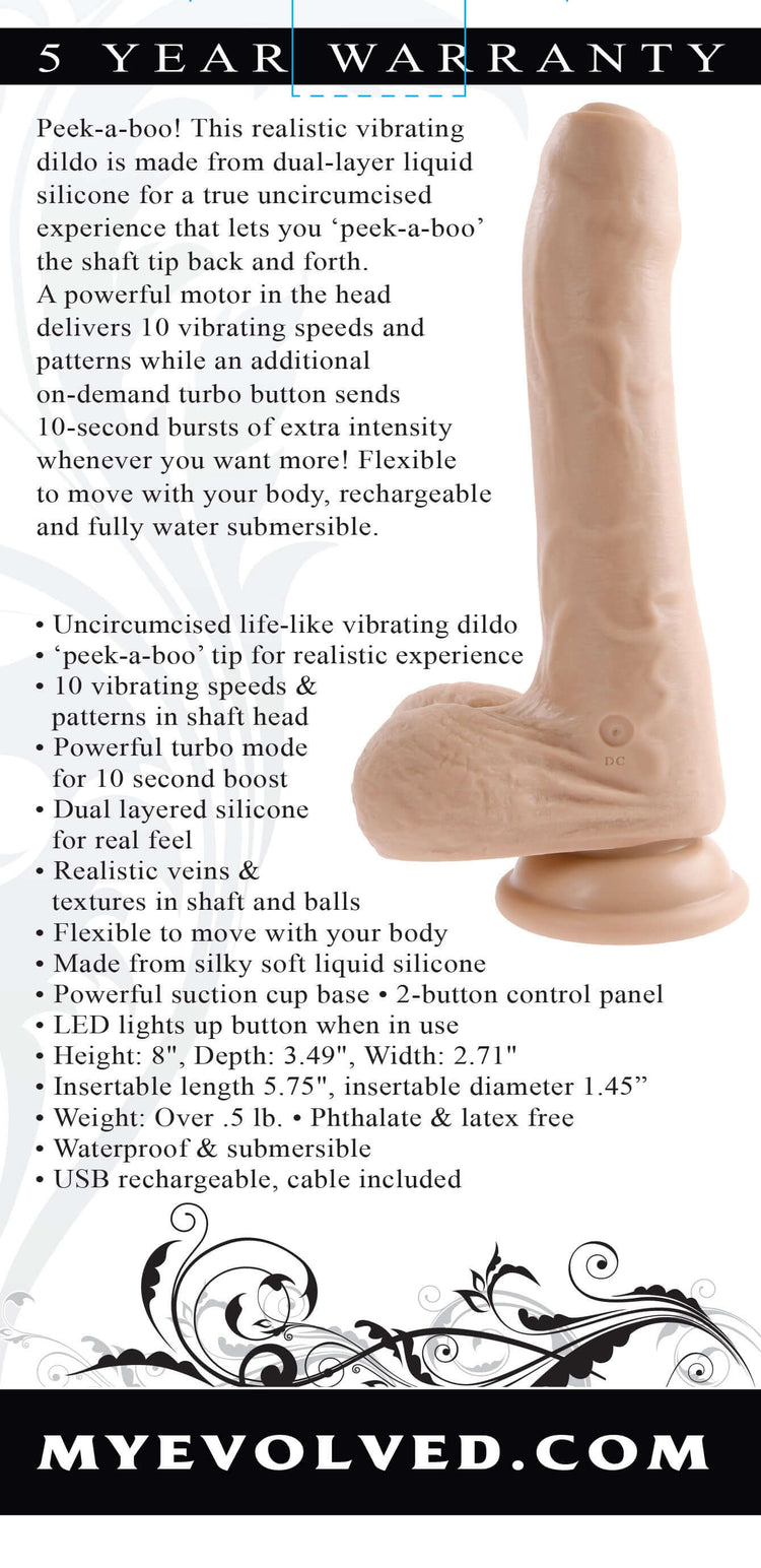 Peek-a-boo! This realistic vibrating dildo is made from dual-layer liquid silicone for a true uncircumcised experience that lets you ‘peek-a-boo’ the shaft tip back and forth. A powerful motor in the head delivers 10 vibrating speeds and patterns while an additional on-demand turbo button sends 10-second bursts of extra intensity whenever you want more! Flexible to move with your body, rechargeable and fully water submersible.