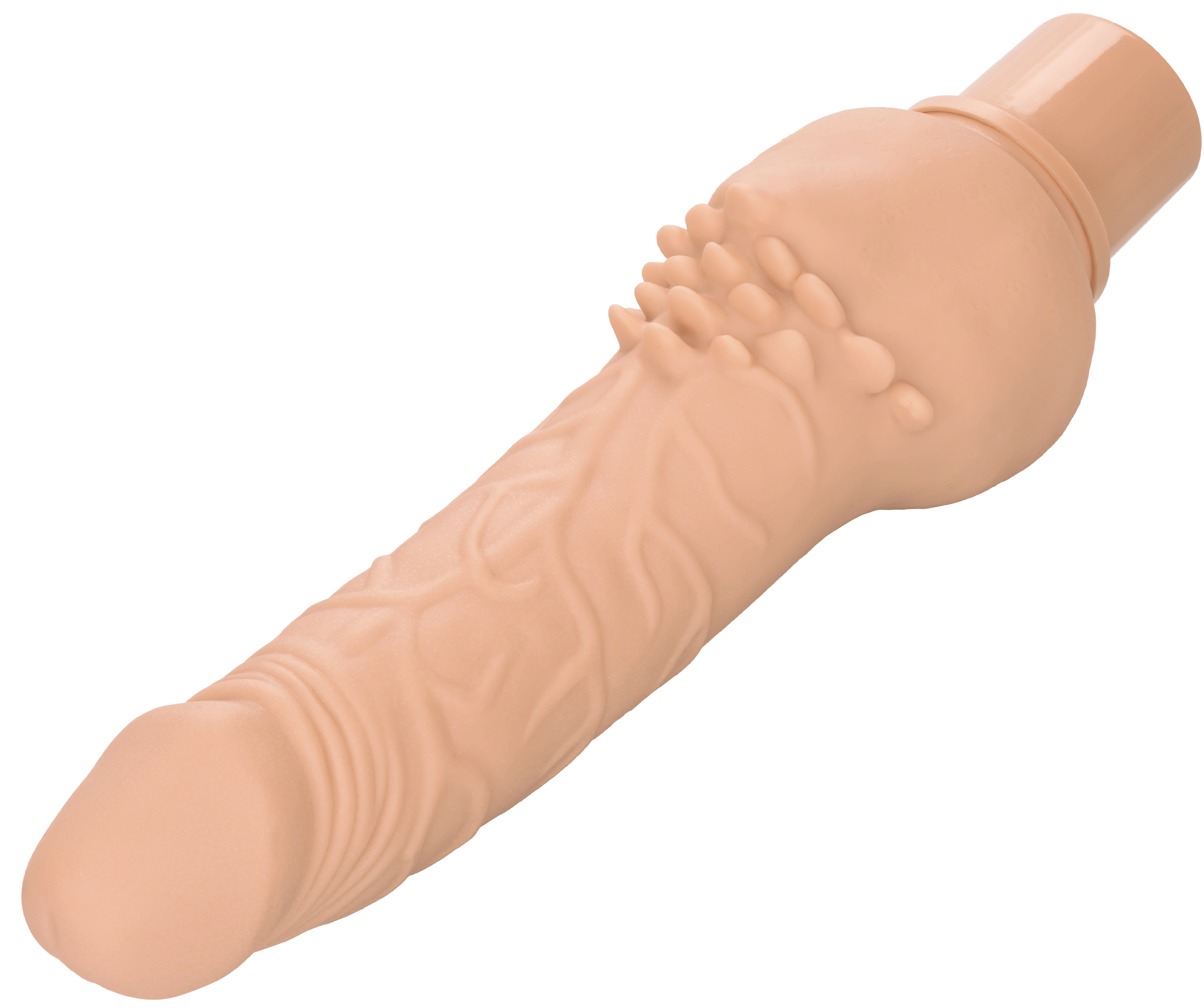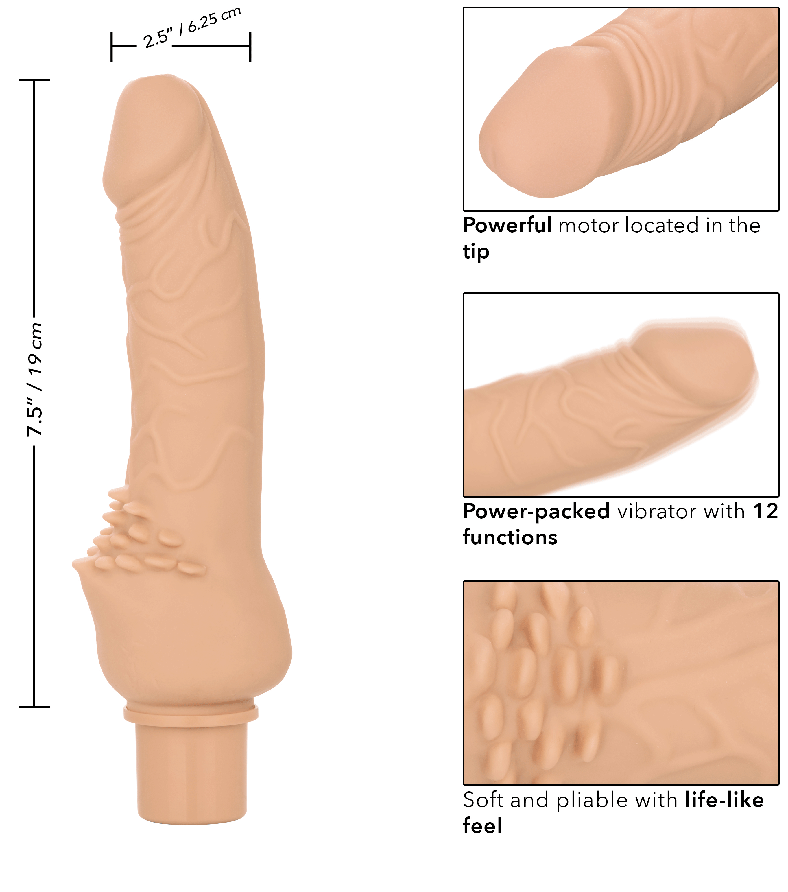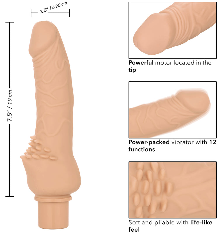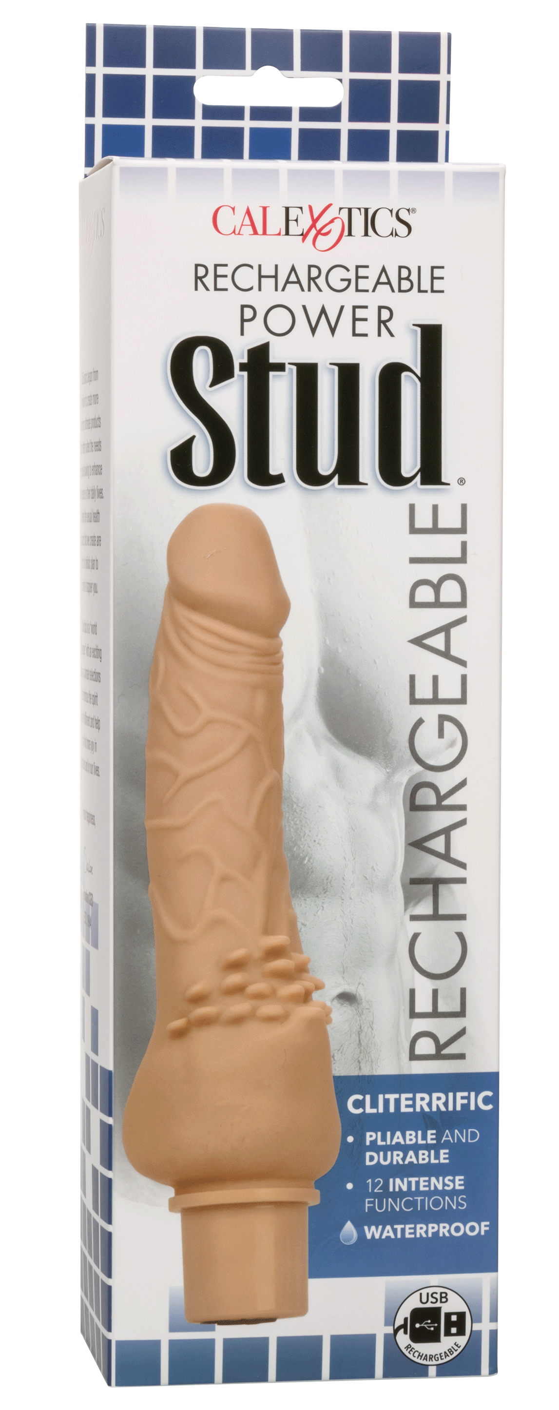 Thrust yourself towards earth-shaking pleasure with the Rumbling Rechargeable Power Stud Cliterrific. The power-packed extra-large vibrator features a flexible real-feel design and 12 functions of vibration. The flexible, yet rigid shaft and soft supple silicone delivers a truly realistic penetration experience. The powerful motor located in the tip of the massager delivers deep, rumbling vibrations. Whether you're taking a dip with a lover or indulging in a steamy solo session, look foward to up to 1 hour of waterproof vibration. Recharge pleasure and get back to playtime in only 1.5 hours with the provided USB cable. Embrace up to 1 hour of vibrations on low speed and 30 minutes on high speed. The flexible massager is made from a hygienically superior silicone. The body safe material is unscented and phthalate free to keep your most sensitive spots happy and healthy.