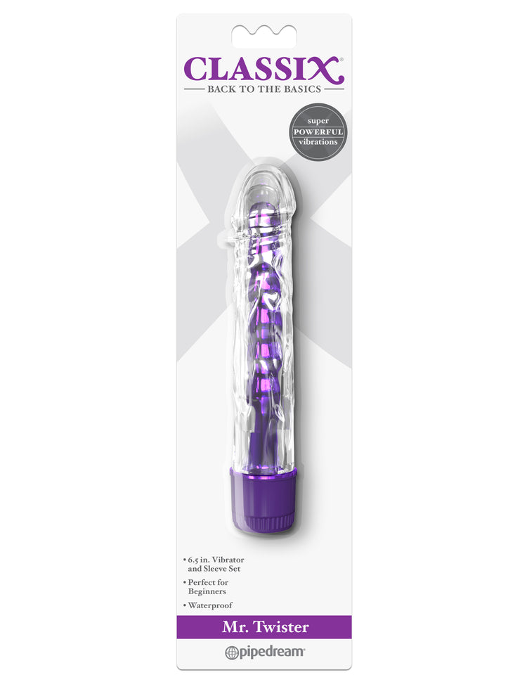 With his crystal clear sleeve and shiny metallic insides, Mr. Twister is the right man for the job! Turn the dial on the multi-speed base and let the powerful vibrations whisk you away! The soft, body-safe sleeve has a veiny swirl texture, lifelike head, and tiny ticklers for extra stimulation. Best of all, the removable sleeve can be used as a penis extension and the beaded vibe can be used alone for vaginal or anal play.